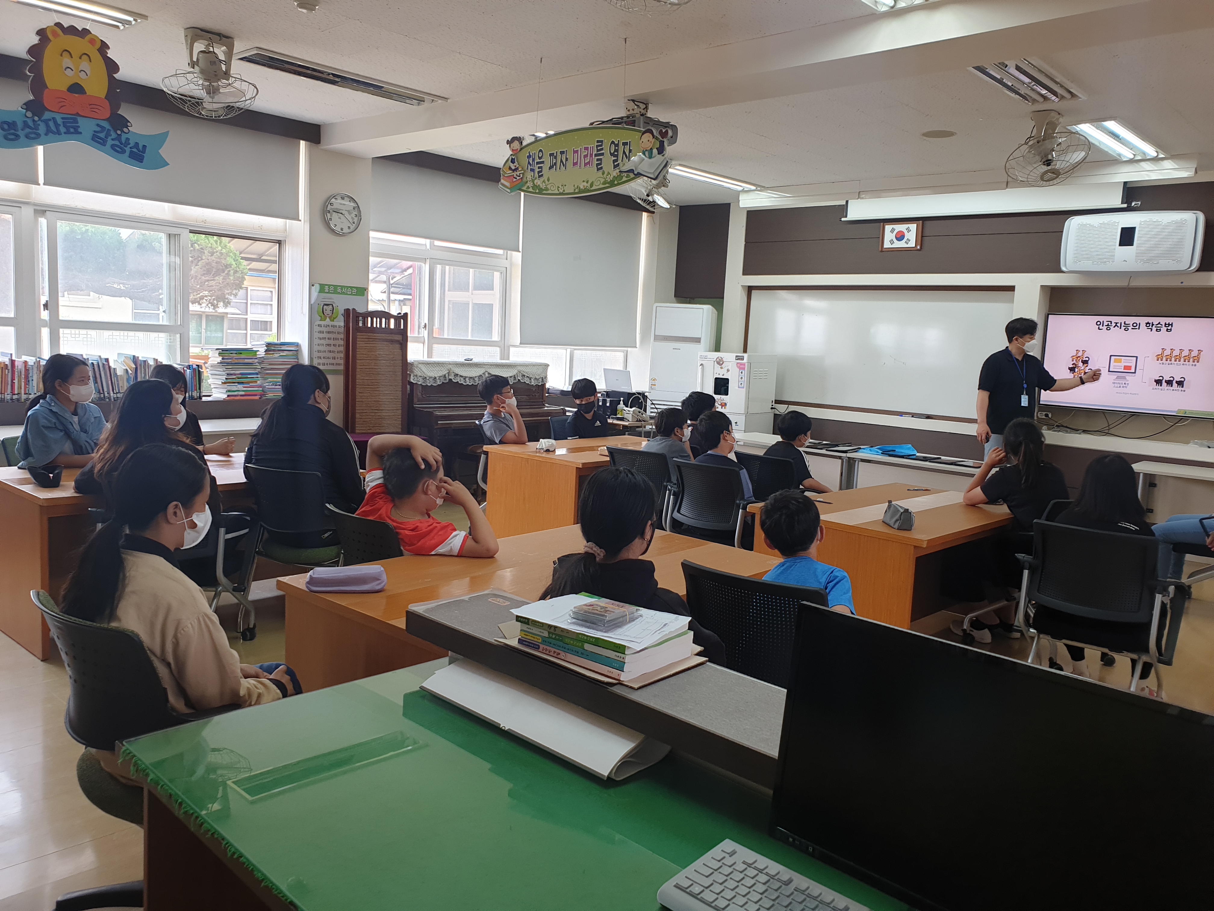 이날 수업은 인공지능(AI) 휴머노이드 로봇 ‘알파미니’에 대해 알아보고 음성명령을 통한 인공지능 기능을 직접 체험해 보는 활동을 하였다. 인공지능 로봇‘알파미니’는 음성 상호작용, 안면인식 그리고 사물 인식 등을 수행하는 로봇으로 학생들이 직접 알파미니에게 다양한 음성명령 및 동작 명령도 해 보았다. 또한 ‘알파미니’ 코딩을 통해 다양한 동작 블록 등 다양한 프로그램도 구연해 보았다.