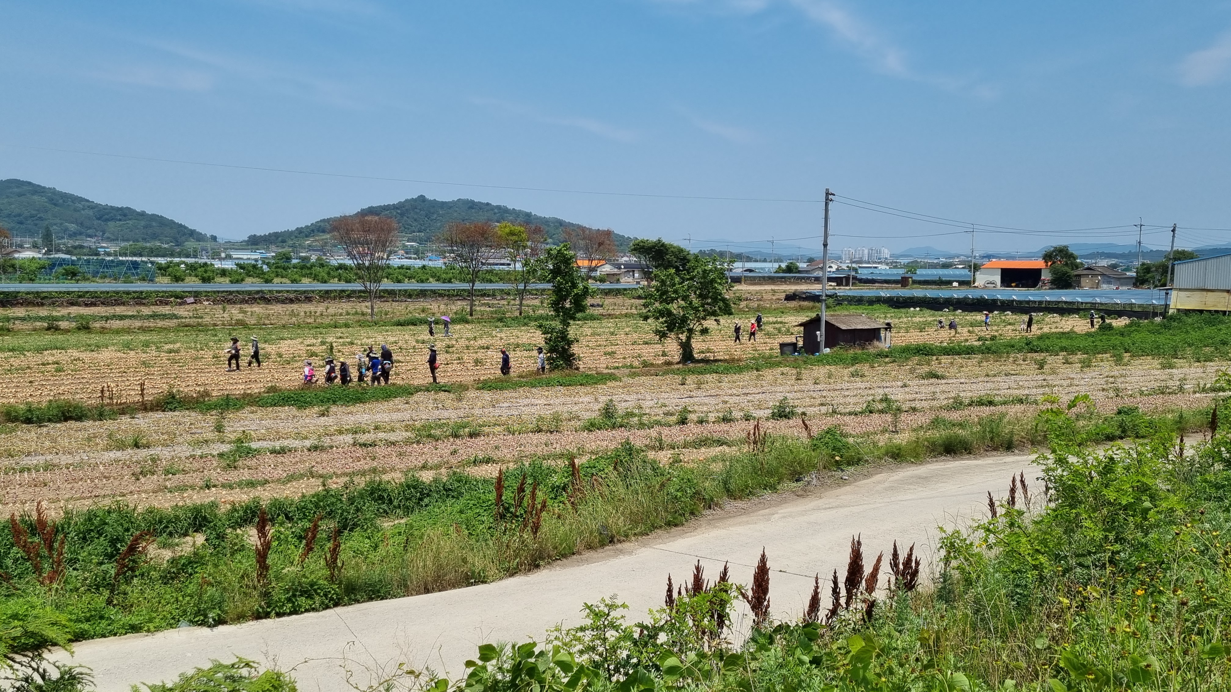 대규모 양파 농사를 짓고 있는 금호읍 황정리 금호강변 부근, 외국인 근로자들이 양파수확 후 잠시 휴식 시간을 가지는 모습