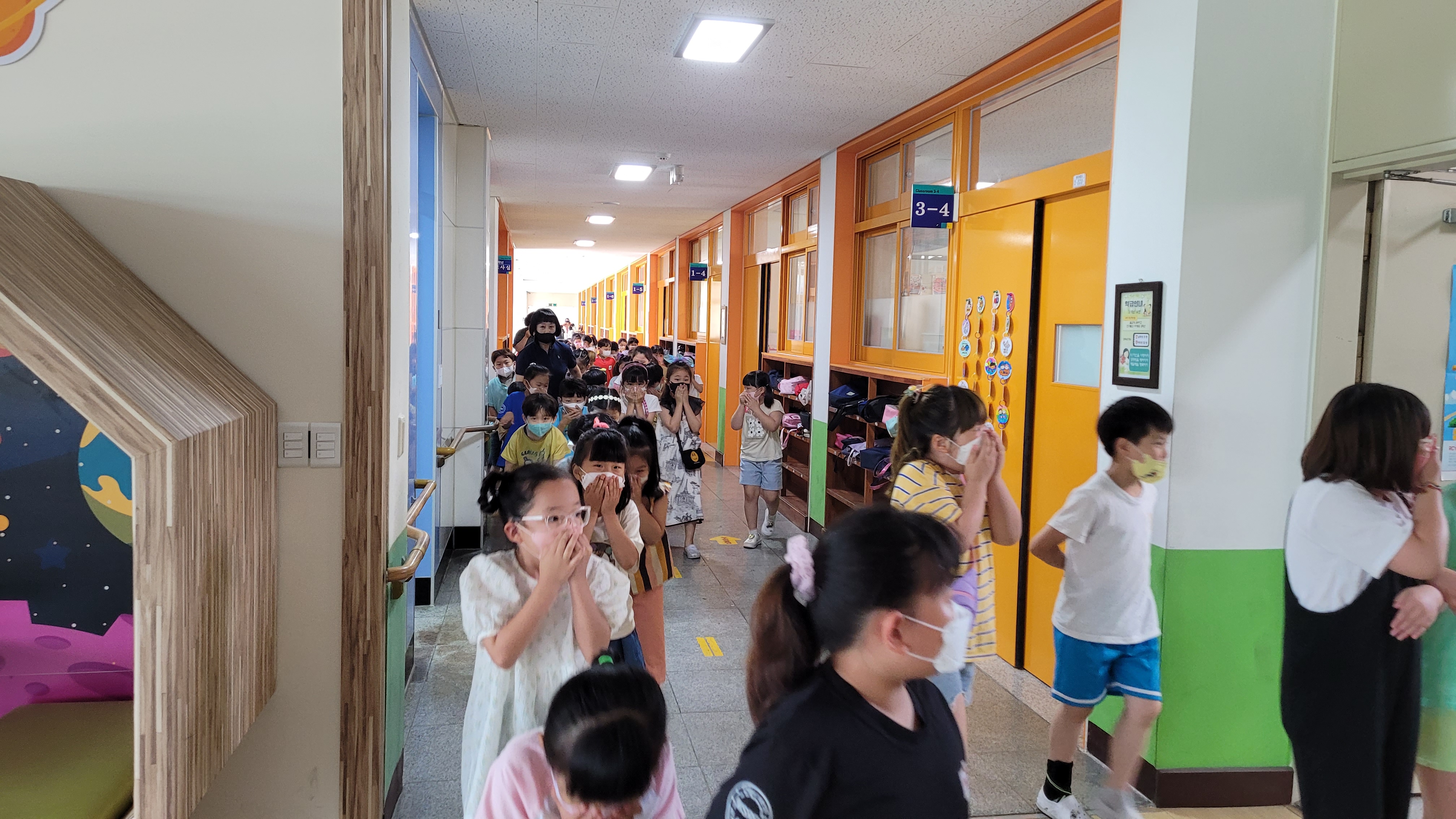 6학년 교사실에서 불이 났다는 모의 상황에 맞추어 학생들은 비상 사이렌이 울린 후 코와 입을 막고 자세를 낮추어 신속하게 운동장으로 대피하였다.