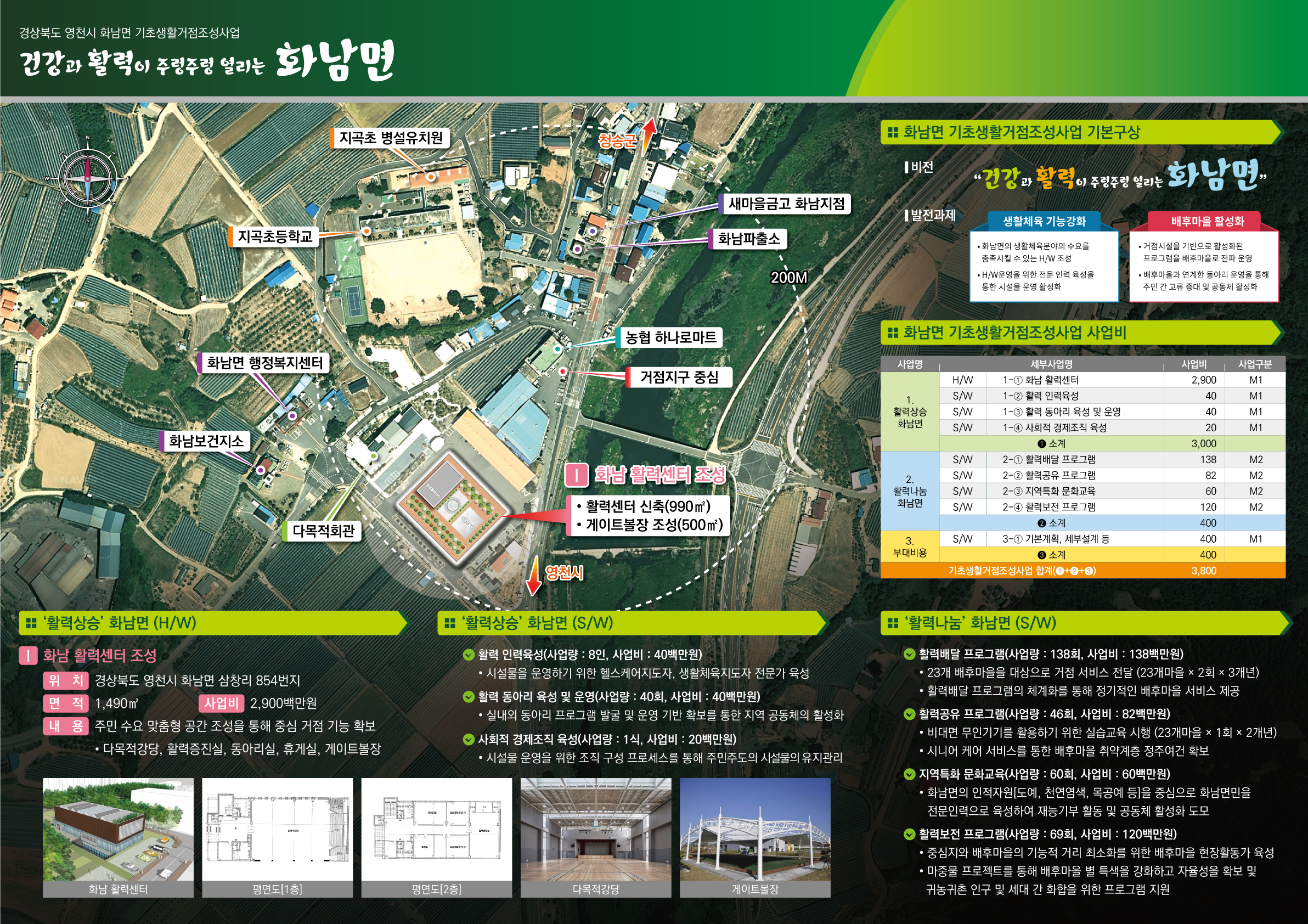 영천시는 이번 공모를 위해 주민 주도의 협의체인 화남면 주민위원회를 구성 후 올해 초부터 주민설명회와 현장포럼 5회, 선진지 견학 등을 추진했으며 주민위원회 회의를 통해 지역민의 실질적인 수요를 반영한 사업계획을 수립, 경북도와 농림축산식품부의 평가를 거쳐 공모사업에 최종 선정됐다.