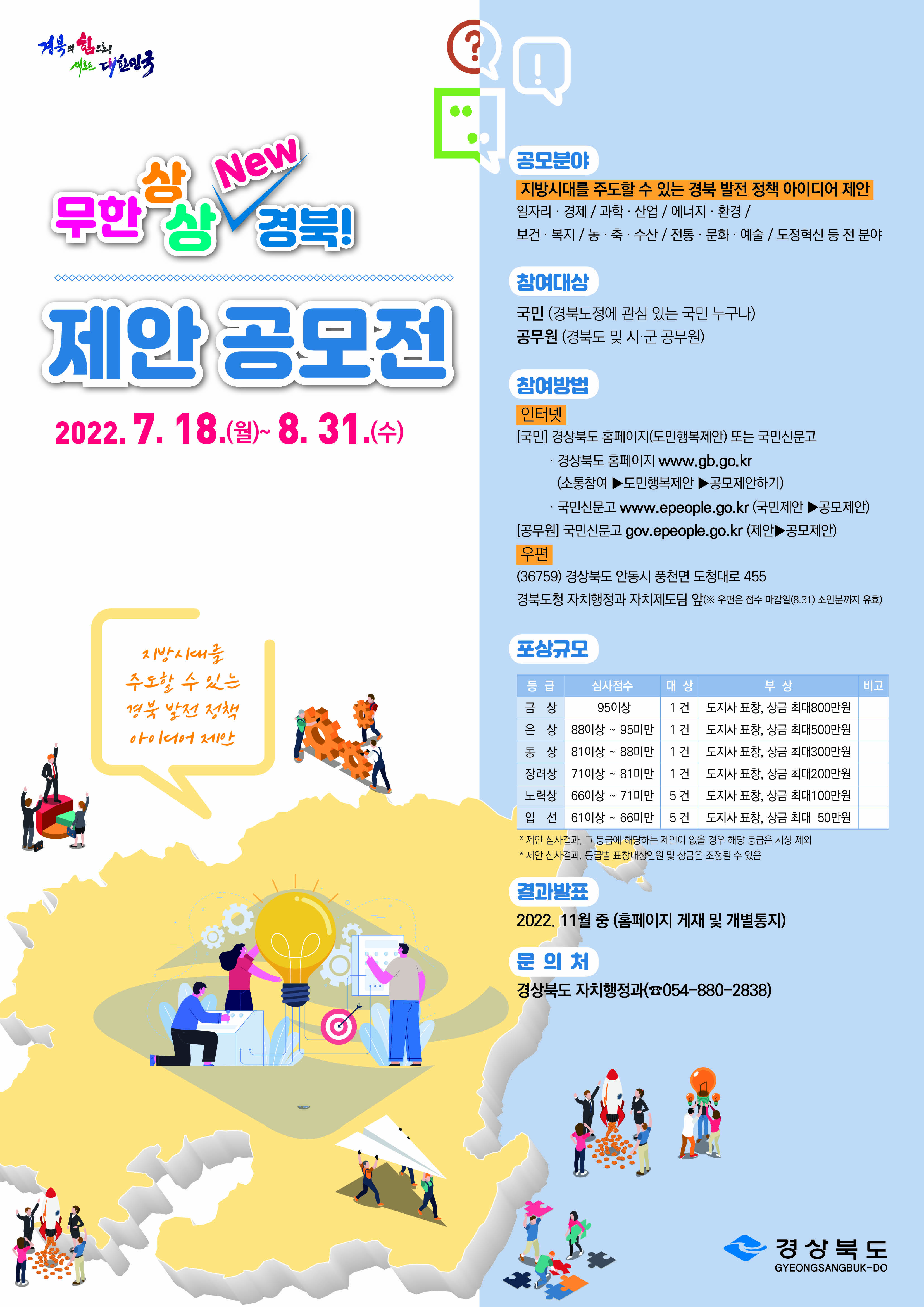 무한상상! 새로운 아이디어 발굴로 새로운 경북 꿈꾸다- 「무한상상! New경북!」 2022년도 제안 공모전 개최 -- 7.18 ~ 8.31까지, 국민신문고 및 도 홈페이지 통해 참여 가능