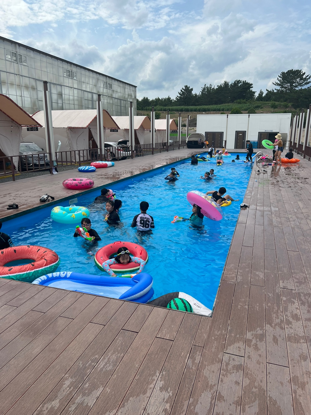 글램핑장 수영장에서 어린이들이 수영으로 건강한 여름을 보내고 있다. 16일 오후 30도가 훨씬 넘는 무더위에 어린이들이 아우노펠리스 글램핑장 야외수영장에 수영을 즐기는 모습이 여유로우면서도 건강해 보인다.
