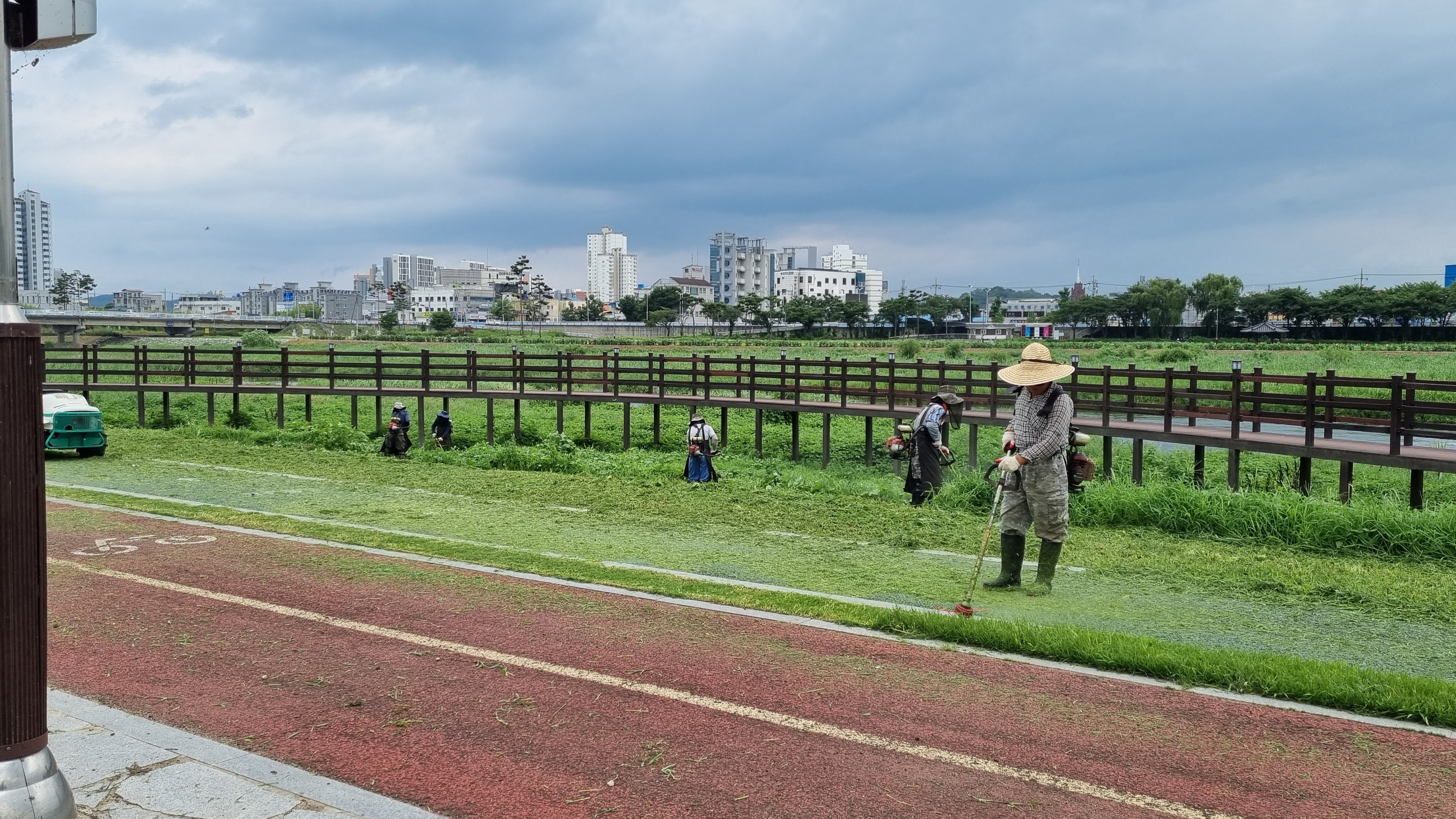 7월 22일 공원관리사업소 직원들은 무더운 날씨에도 둔치 제초작업으로 둔치에서 운동을 즐기는 시민들에 편안함과 즐거움 선사하고 있다. 제초작업은 며칠 동안 둔치 전체에서 이루진다고 한다.