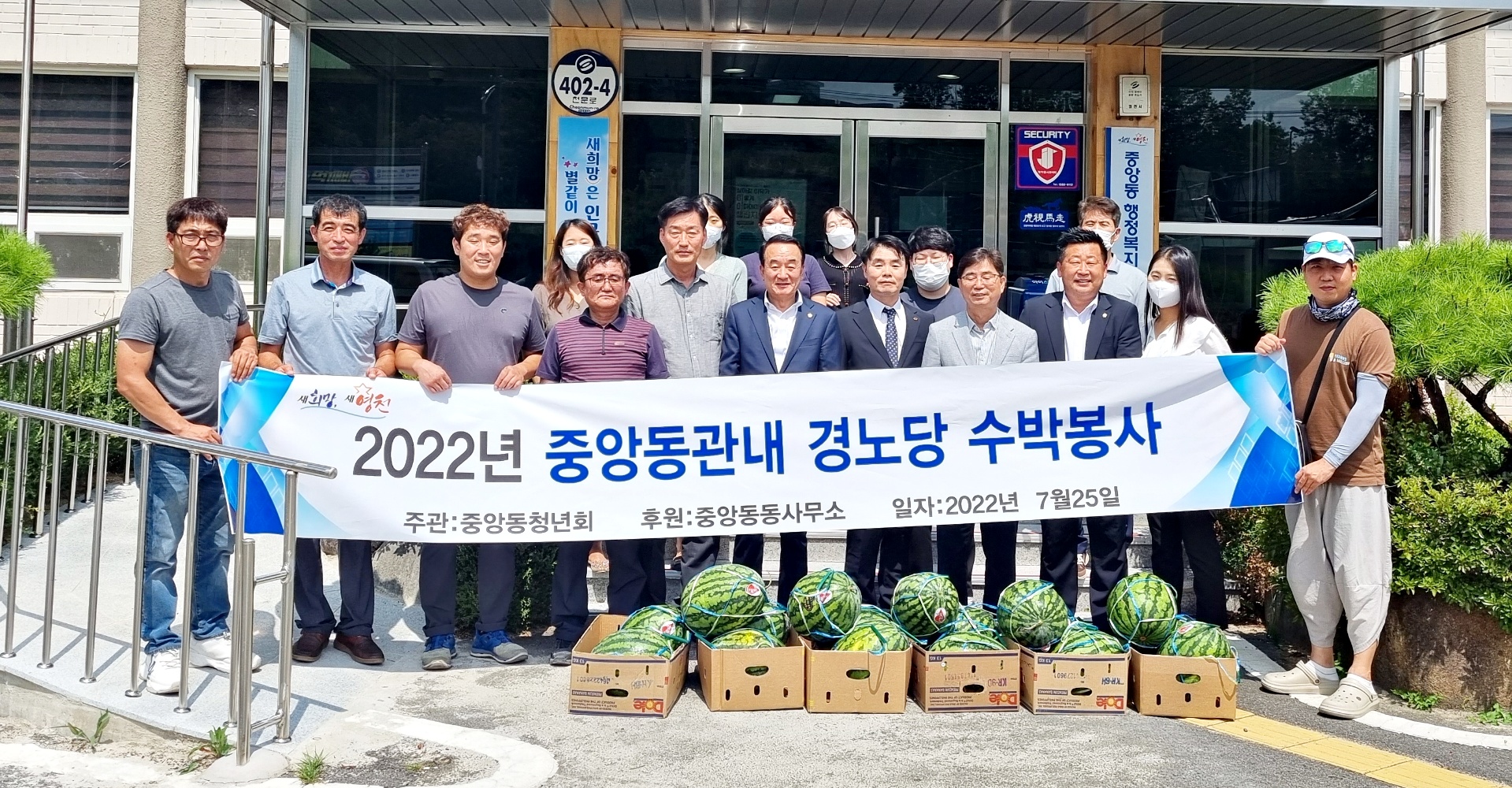 한창훈 청년회장은 “후덥지근한 날씨에 달달한 수박 드시고 건강하게 여름을 나셨으면 좋겠다. 앞으로도 중앙동 행정복지센터와 함께 행복한 중앙동 만들기에 앞장서겠다”고 말했다.