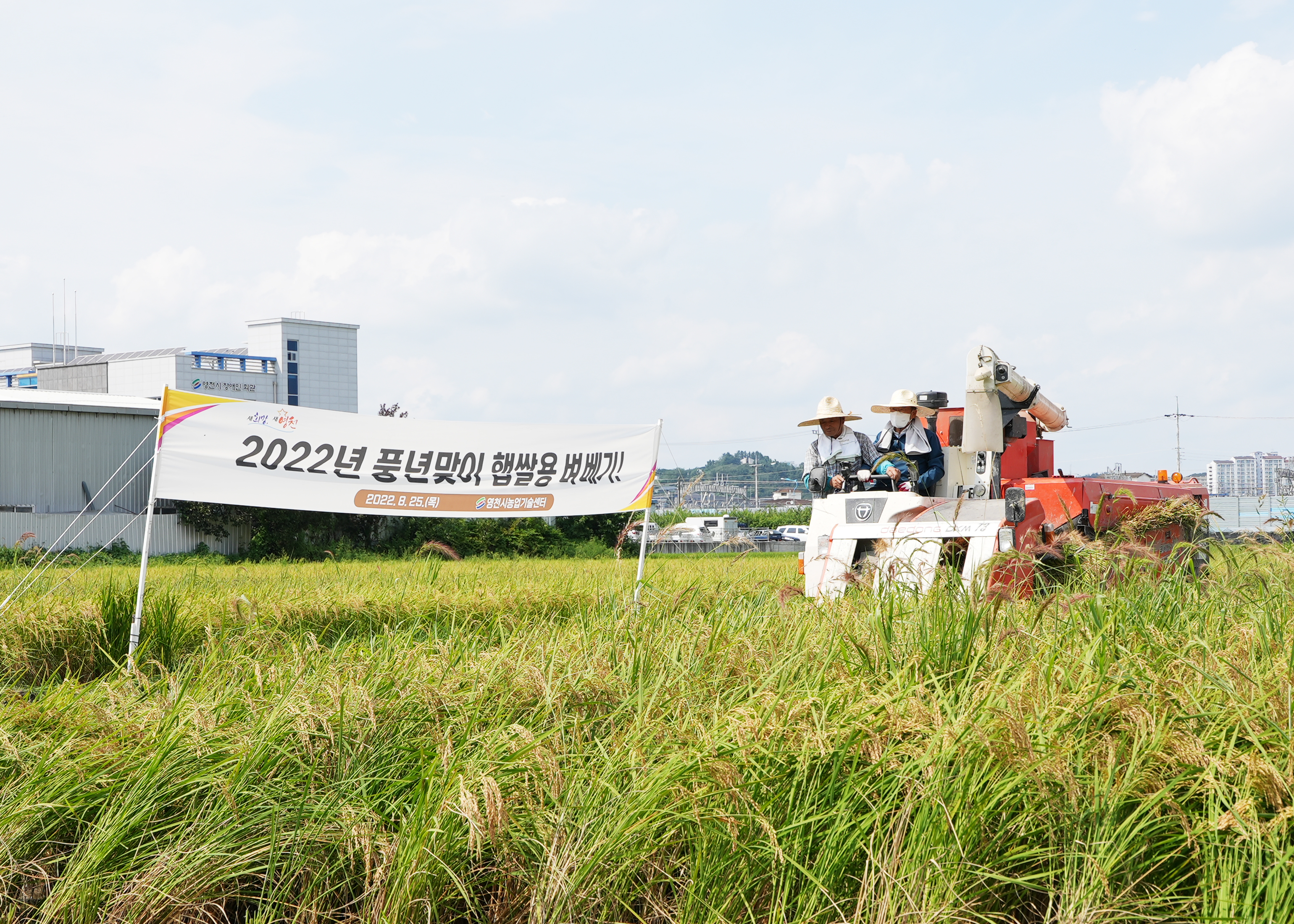 문종복 씨(75)가 8월 25일 주남 들녘에서 추석 전 햅쌀용 벼 베기를 시작했다. 이번에 수확하는 벼는 4월 25일 모내기를 하고 120여 일 만에 수확했다. 친환경으로 재배한 벼는 추석 전 햅쌀로 소비자들에게 인기가 높다. 사진은 최기문 시장과 문종복 씨가 벼를 수확하는 모습.