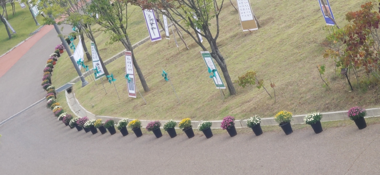 한편, 테마촌 가로수에는 제5회 학생서예공모대전에서 입상한 현수막화 작품 250개가 언덕길에는 300개의 국화꽃 화분이 주변의 조형물과 잘 어우러져 새로운 포토존으로 인기를 얻고 있다.