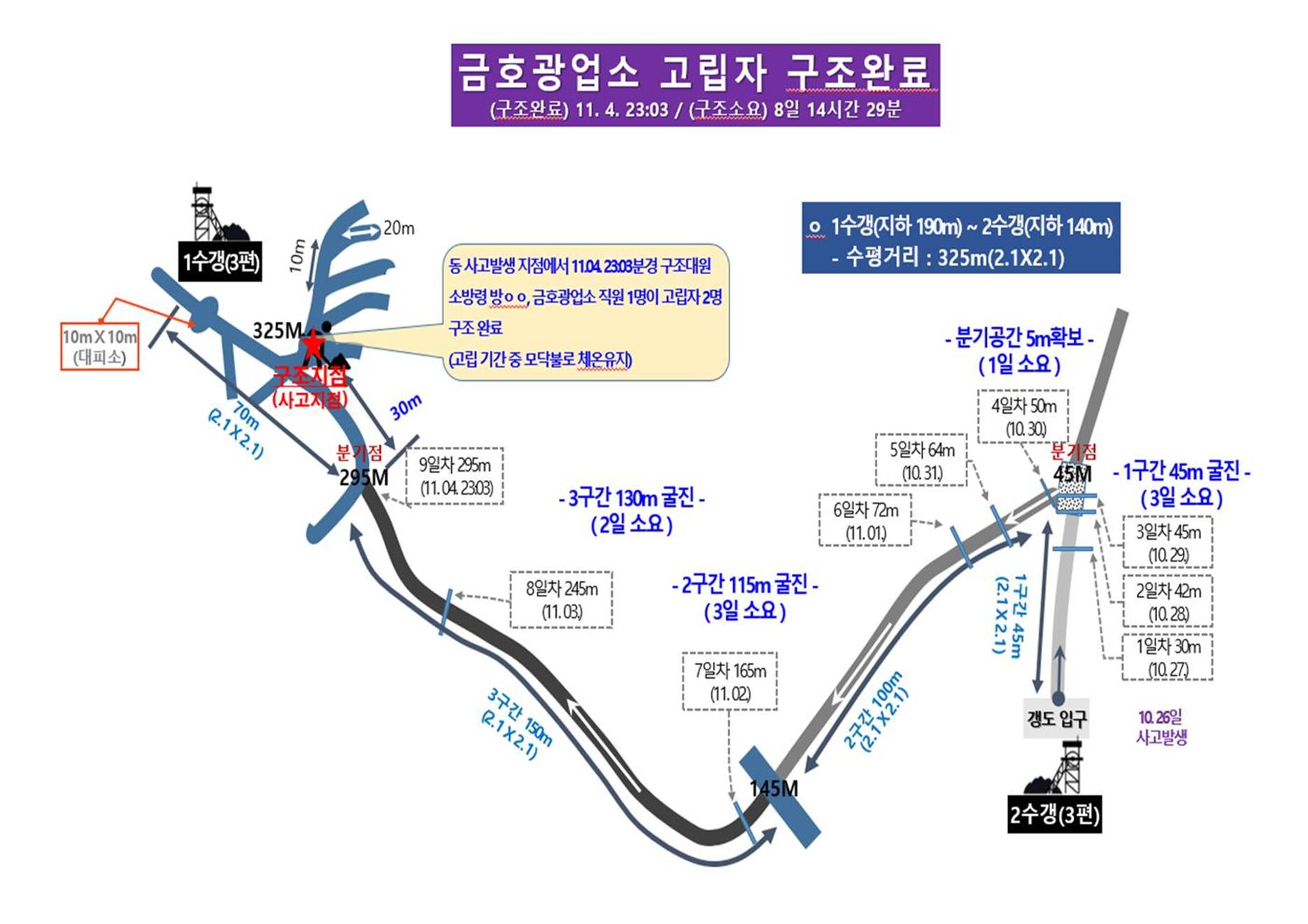 마침내, 9일차인 지난 4일 예상지점인 325미터까지 굴착이 이루어졌고 소방대원과 금호광업소 동료광부가 고립생존자 2명을 구조해 안동병원으로 이송했다.