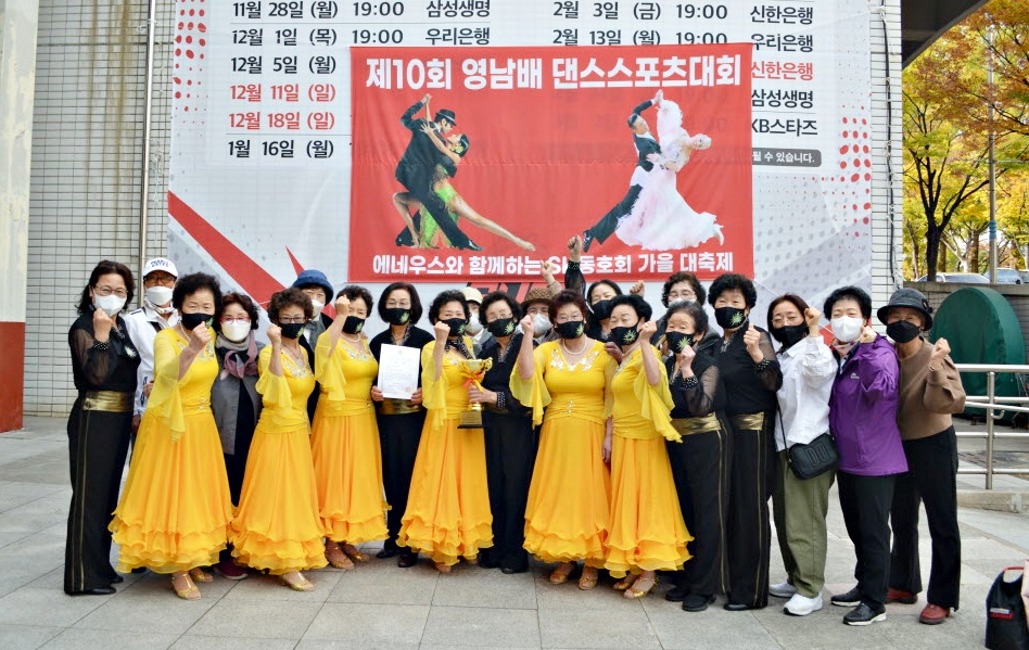 영천시 요요공연예술단(단장 허정분)은 10월 29일 부산 사직체육관 보조경기장에서 열린 제10회 영남배 전국 댄스스포츠 선수권 대회에 출전하여 단체 포메이션 부문(시니어부)에서 1위를 수상했다.