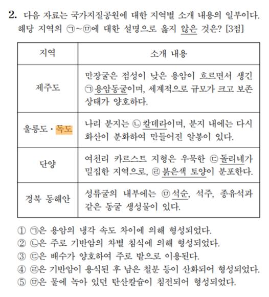 먼저, 한국지리 과목 2번 문항은 국가지질공원 지역에 대한 설명으로 제주도, 울릉도, 독도, 단양, 경북 동해안 등을 소개하며 독도는 단순 예시로 언급되었다.