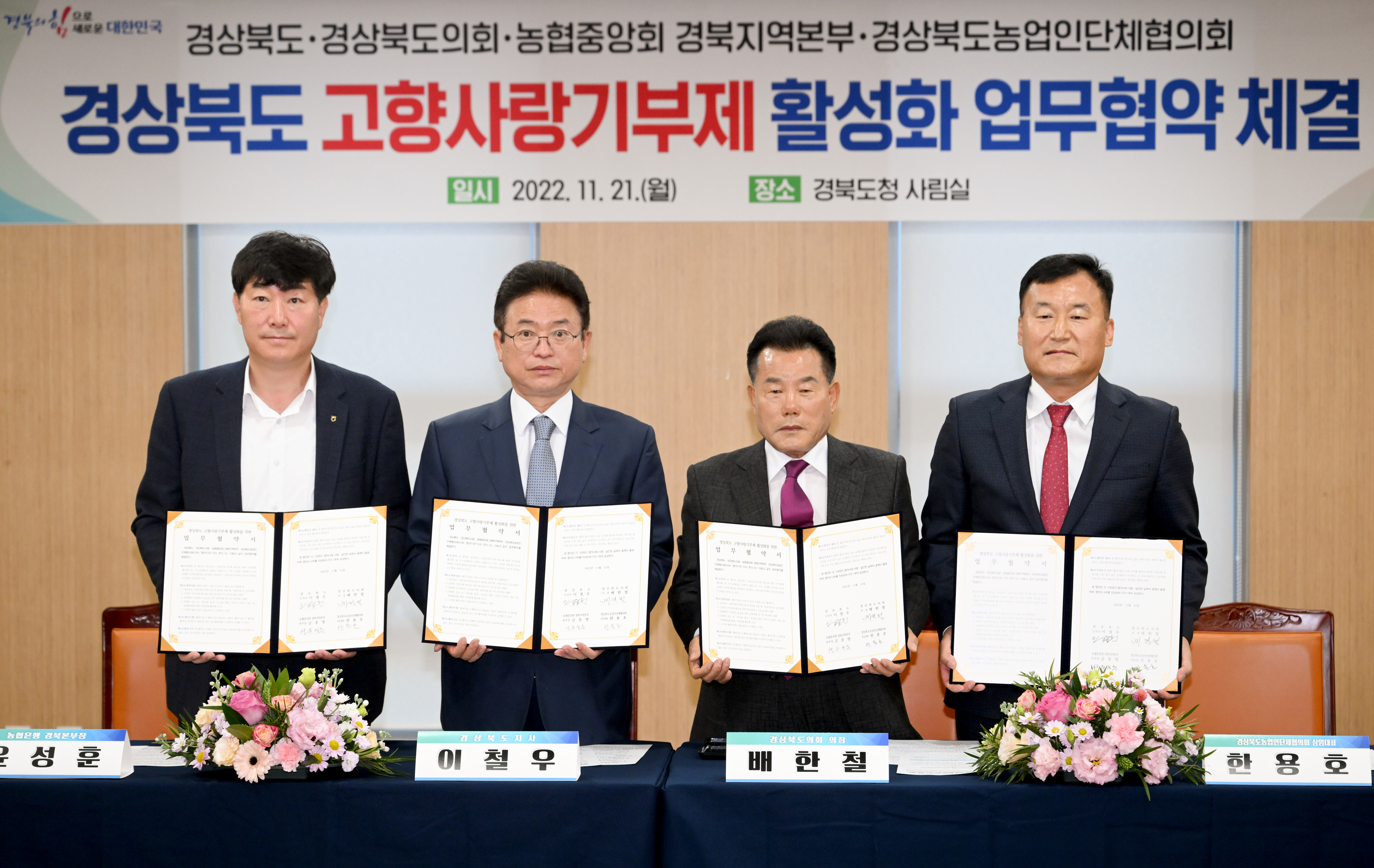 경상북도는 21일 도청 회의실에서 경북도의회, 농협중앙회 경북지역본부, 경북농업인단체협의회와 고향사랑기부제 활성화를 위한 업무협약을 체결했다.