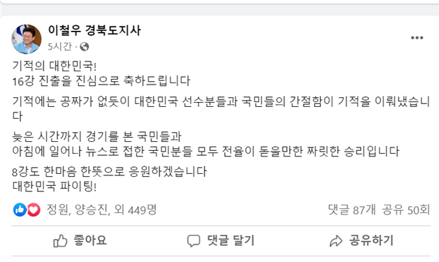 이철우 도지사는 “기적의 대한민국! 16강 진출을 진심으로 축하드립니다”라며 말문을 열었다.