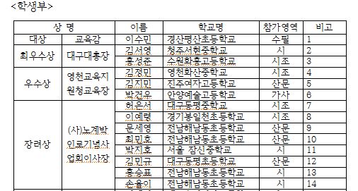 “12일 시상식, 윤원섭 권순희 박찬희 일반부 대상 - 이수민 학생부 대상”