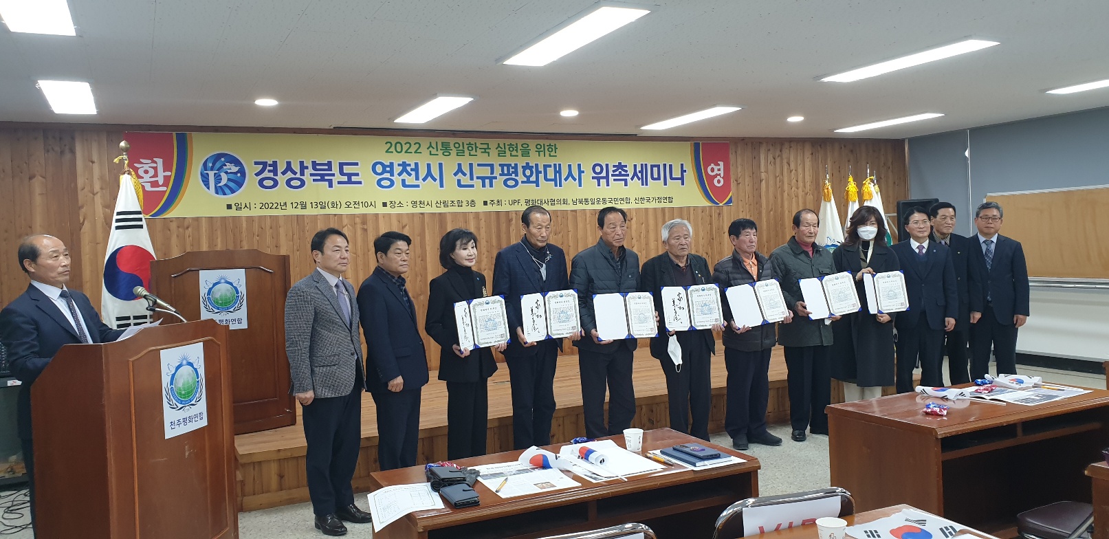 2022 신통일한국 실현을 위한 경상북도 영천시 신규평화대사 위촉세미나가 13일 오전 영천시산림조합 3층 대회의실에서 한혜련 전도의원, 성영관 전영천문화원장 및 회원 등 1백여 명이 참석한 가운데 열렸다.