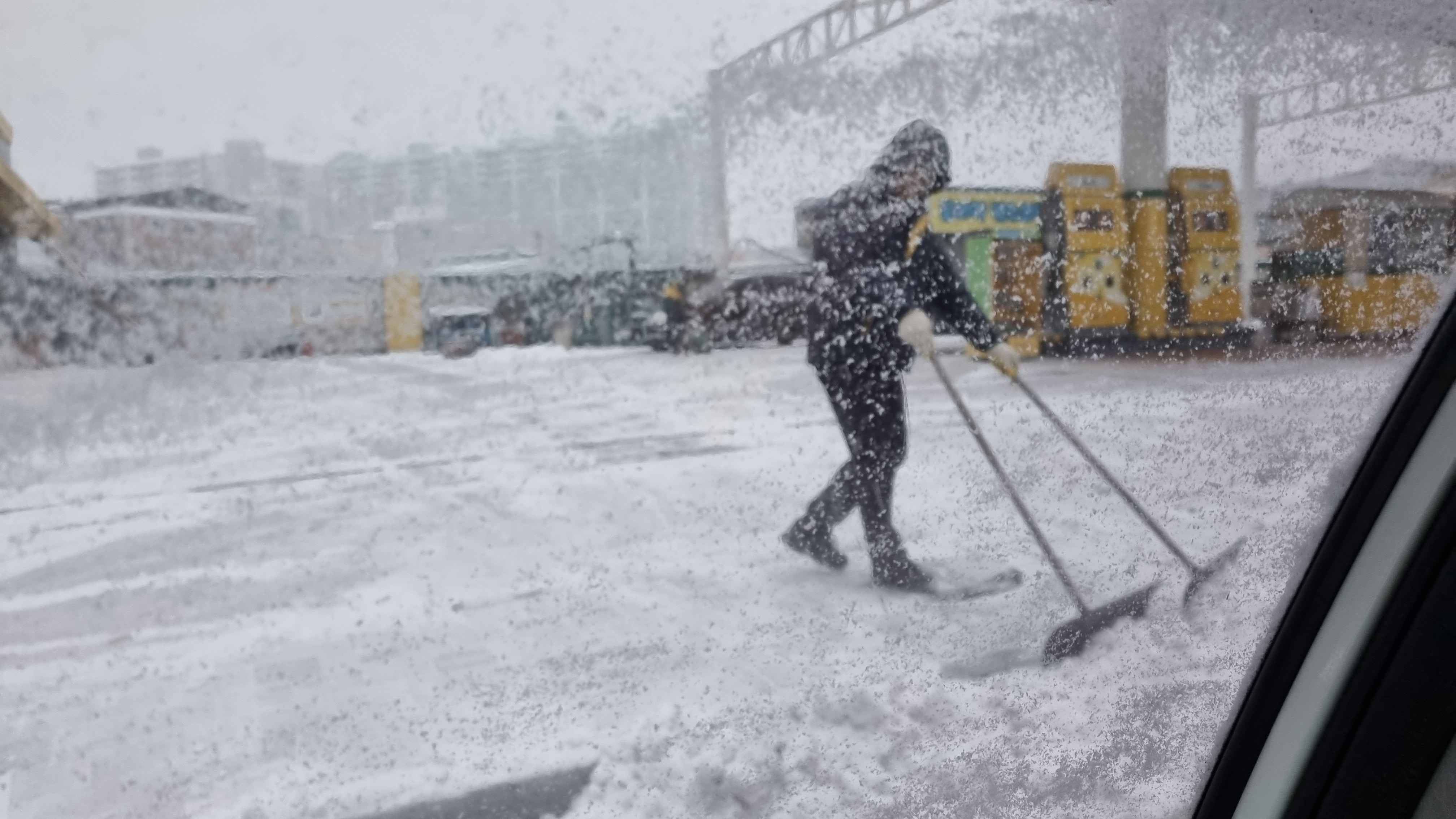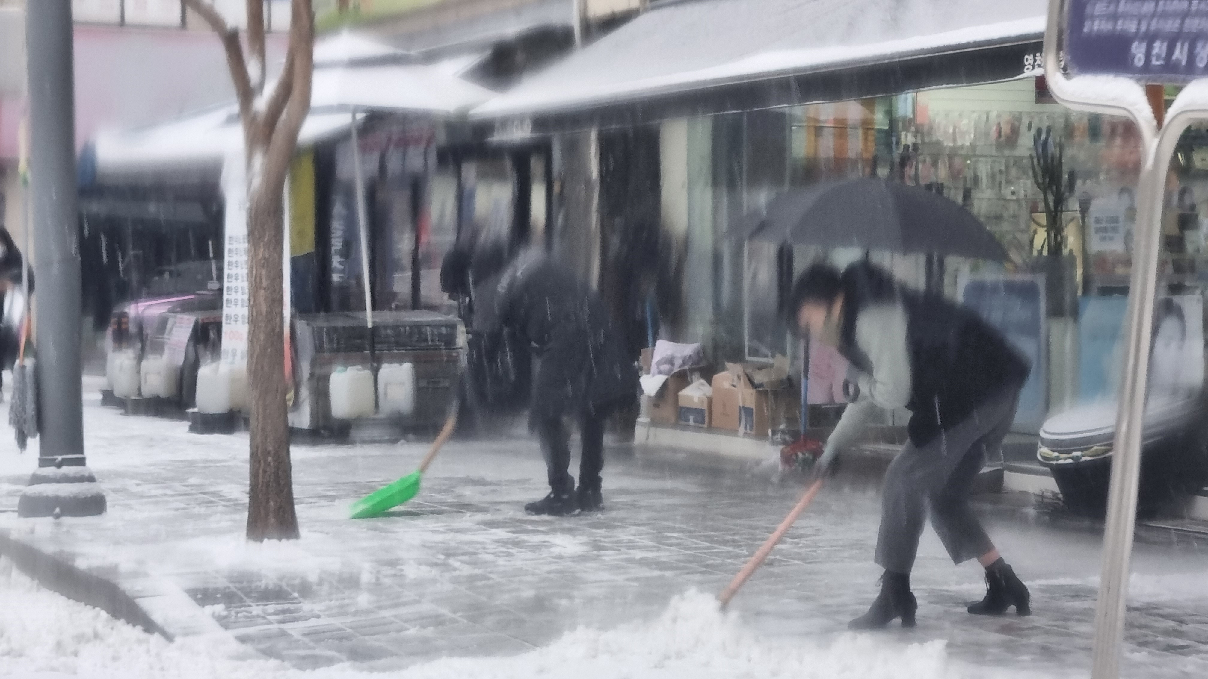 새벽에 내린 눈으로 아침 출근길 도로는 곳곳에서 정체를 빚었다. 도로변 가게들은 일찍 나와 눈을 치우며 손님 맞을 준비하는 모습도 보였다.