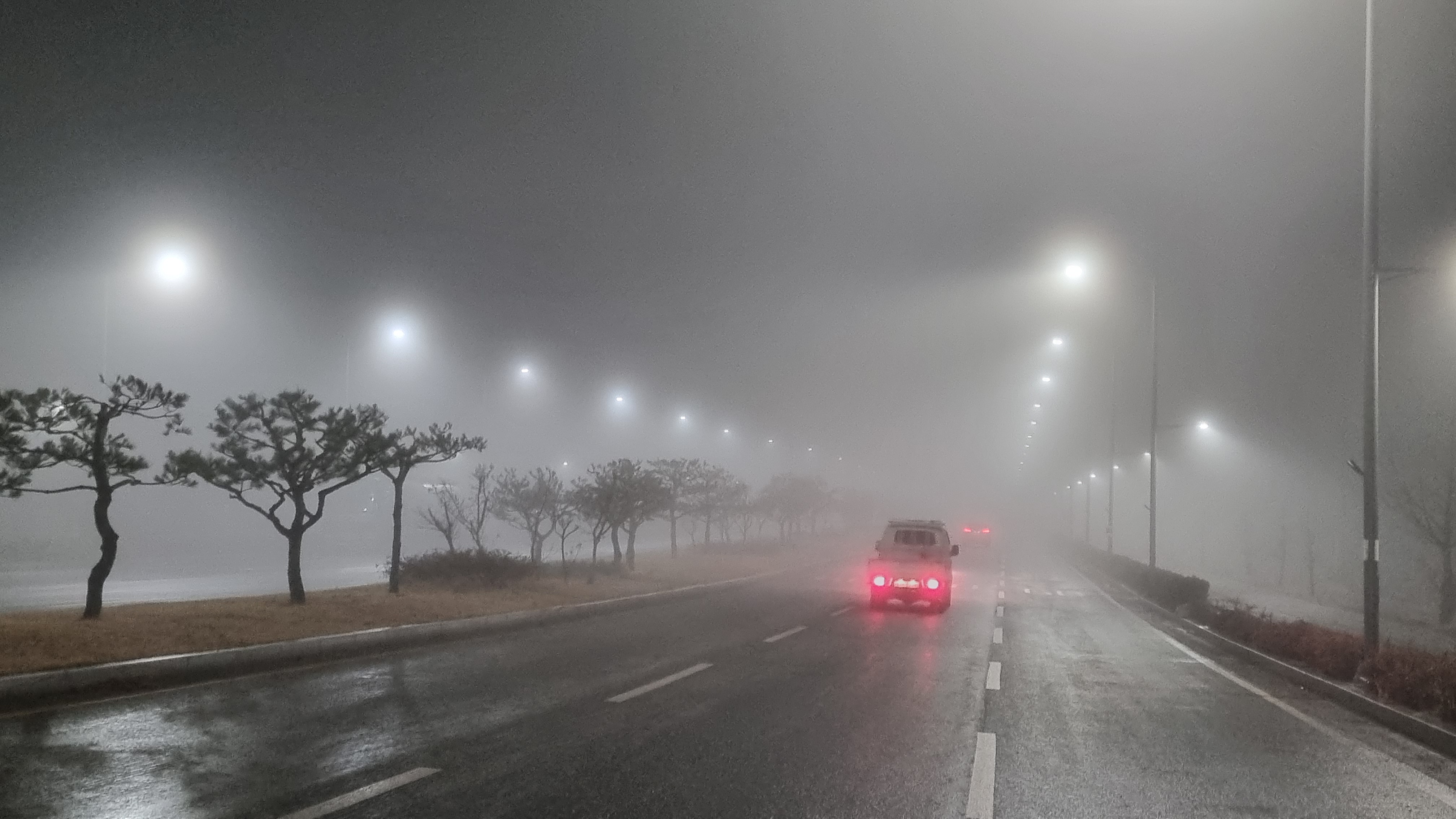 “짙은 안개 자욱한 경마장 가는 큰도로”