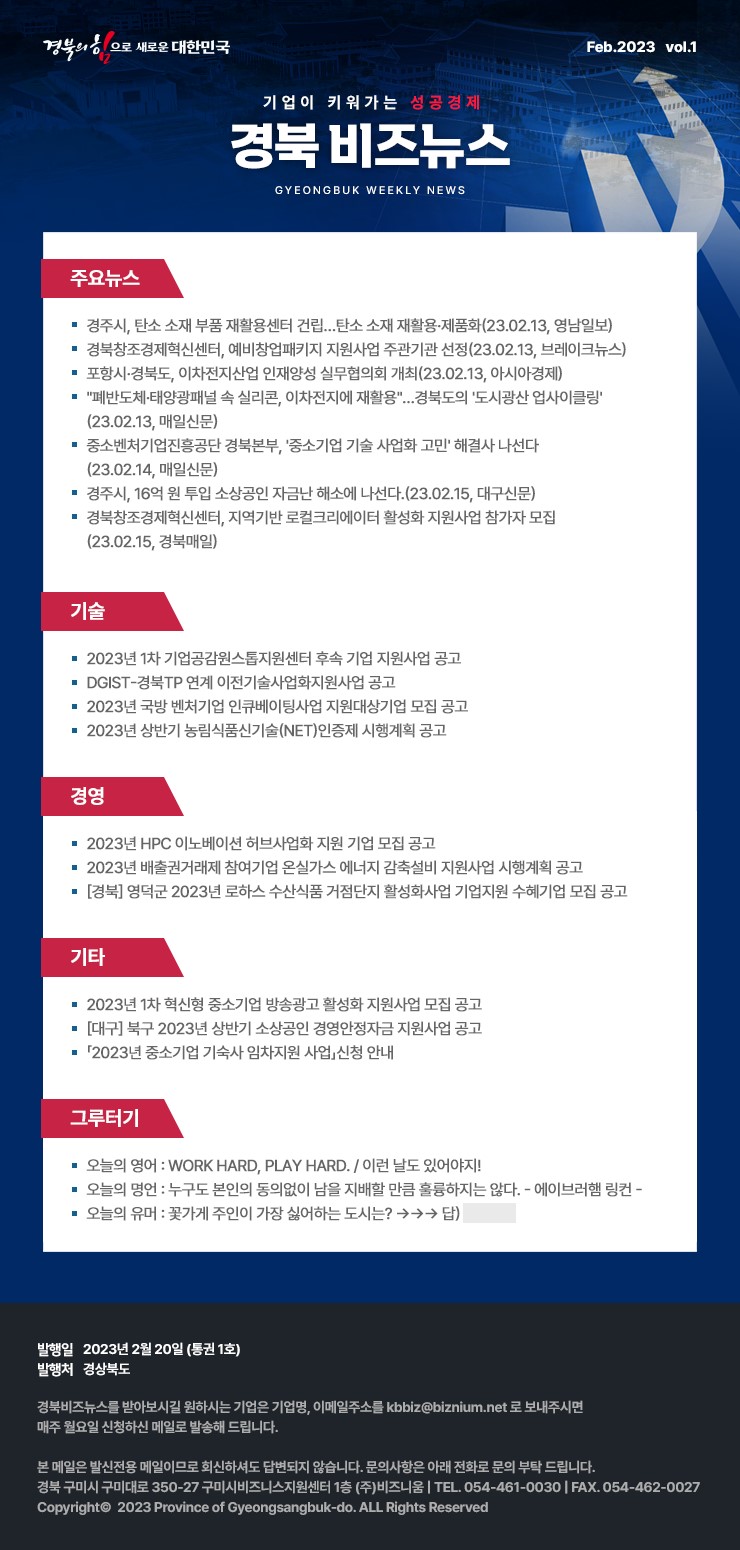 이런 어려움을 해결하기 위해 도내 기업들로부터 신청을 받아 2월 20일부터 매주 월요일 주 1회 이메일로 ‘경북 비즈뉴스’ 서비스를 제공하기로 했다.