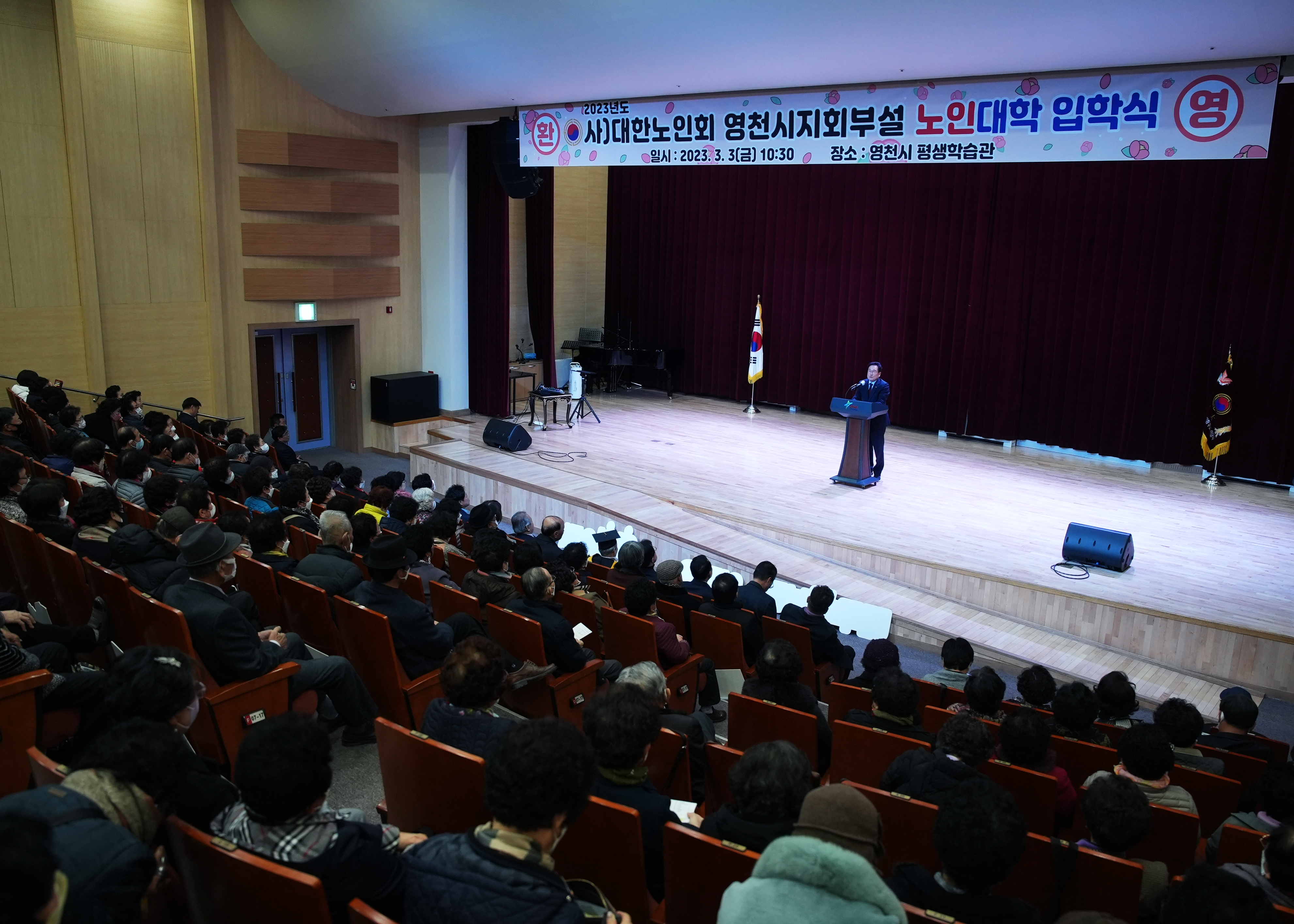 건강한 노후생활 준비(사)대한노인회 영천시지회 부설 노인대학(대학장 이육만)은 3월 3일 평생학습관 우석홀에서 노인대학생, 기관단체장 등 280여 명이 참석한 가운데 제28기 노인대학 입학식을 개최했다.