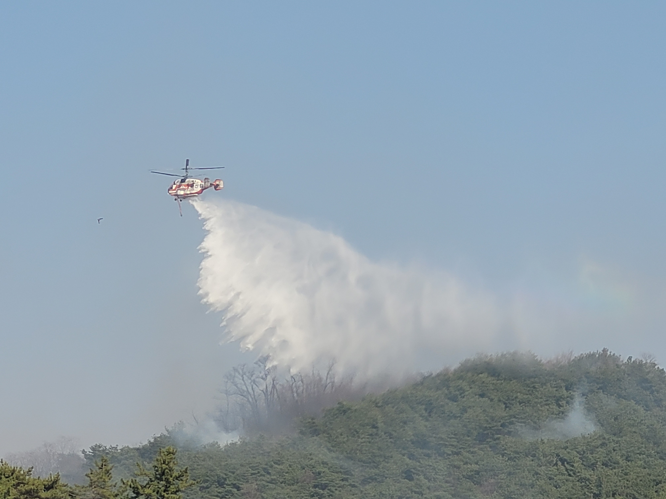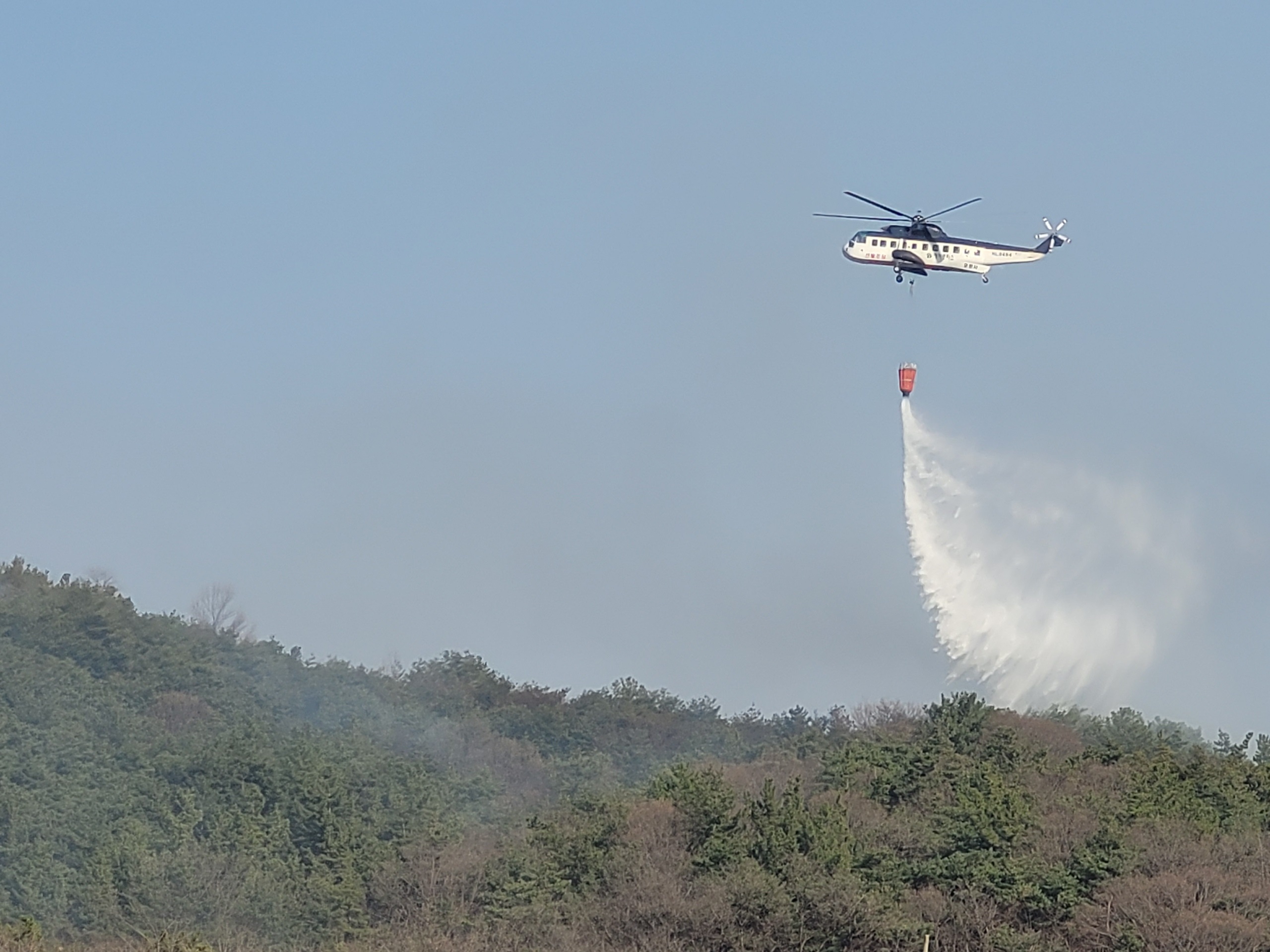 3월19일 오후 청통면 죽정리 산에서 불이나 헬기 8대가 현장에 출동, 대형 분수를 이루며 뿜어내는 물로 인해 빨리 진화됐다.