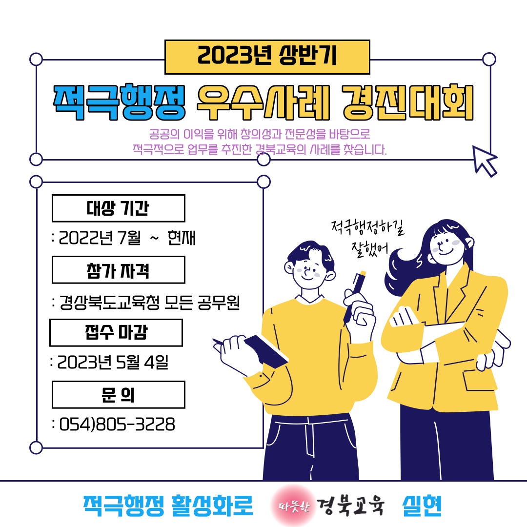 경북교육청(교육감 임종식)은 청렴하고 적극적인 공직문화 조성 및 우수 사례 공유를 위해‘2023년 상반기 적극행정 우수사례 경진대회’를 개최한다고 10일 밝혔다.