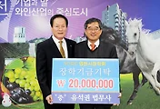 정한표 이사장과 박종태 동부장(왼쪽)이 쌀을 전달하고 있다