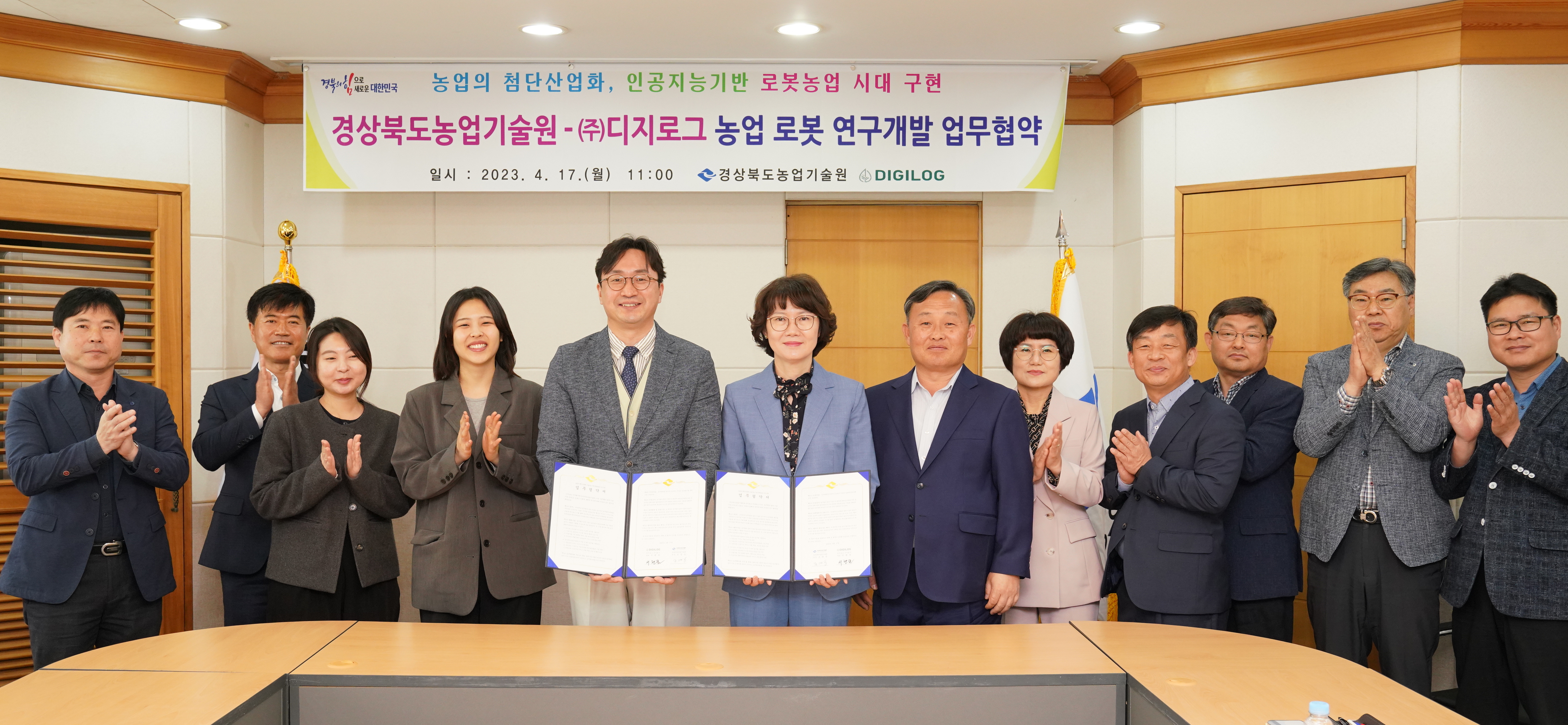 경상북도농업기술원은 17일 회의실에서 조영숙 농업기술원장, 서현권 디지로그 대표 등 관계자들이 참석한 가운데 「농업의 첨단 산업화, 로봇농업 시대 구현을 위한 환경감시․병해충 방제․수확 로봇개발」 업무협약(MOU)을 체결했다.