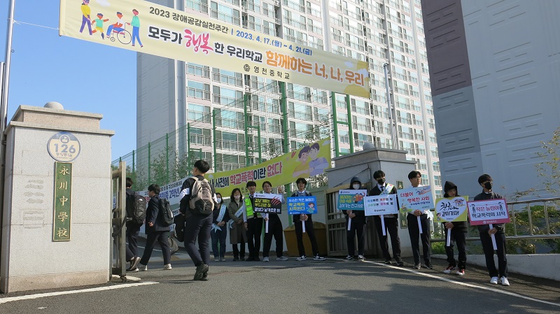 영천중학교(교장 김정남)는 4월 17일부터 4월 21일까지 전교생 및 전교직원을 대상으로 장애공감실천 주간을 운영하며 4월 19일 등굣길에 ‘모두가 행복한 우리 학교 함께하는 너, 나, 우리’를 주제로 장애인식개선 캠페인을 실시하였다.