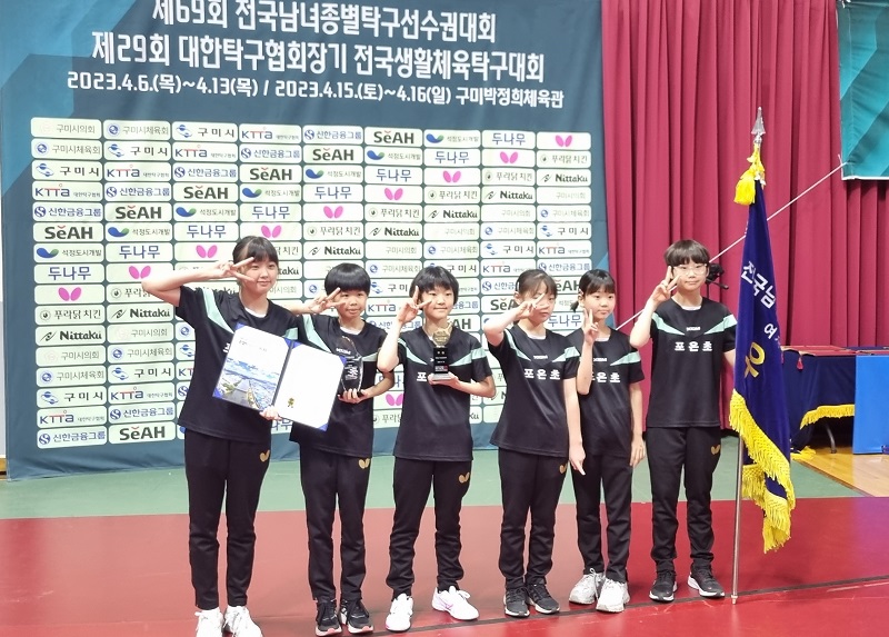 포은초등학교(교장 심선자) 탁구부 학생선수들은 4월6일부터 11일까지 경북 구미 박정희체육관에서 열린 제69회 전국남녀종별 탁구선수권대회에 출전하여 단체전 우승, 개인복식 준우승, 개인단식 준우승, 3위의 우수한 성적을 거두었다. 그리고 4월12일부터 16일까지 경북 김천실내체육관에서 열린 제49회 회장기 전국초등학교 탁구대회에 출전하여 단체전 3위, 개인단식(5학년부) 우승의 우수한 성적을 거두었다.