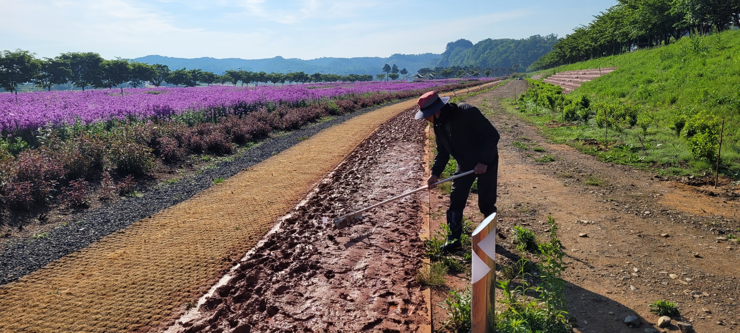 영화교 위쪽 둔치 황토 걷기 운동장이 며칠 동안 내린 비로 인해 엉망인 상태다. 이는 걷기 운동을 좋아하는 시민들이 비가 내리는데도 걷기를 계속했기 때문인데, 비가 내릴 때는 걷기 운동을 중단하는 것이 바람직하다. 8일 아침 일찍부터 이곳을 다시 정비하고 있다.