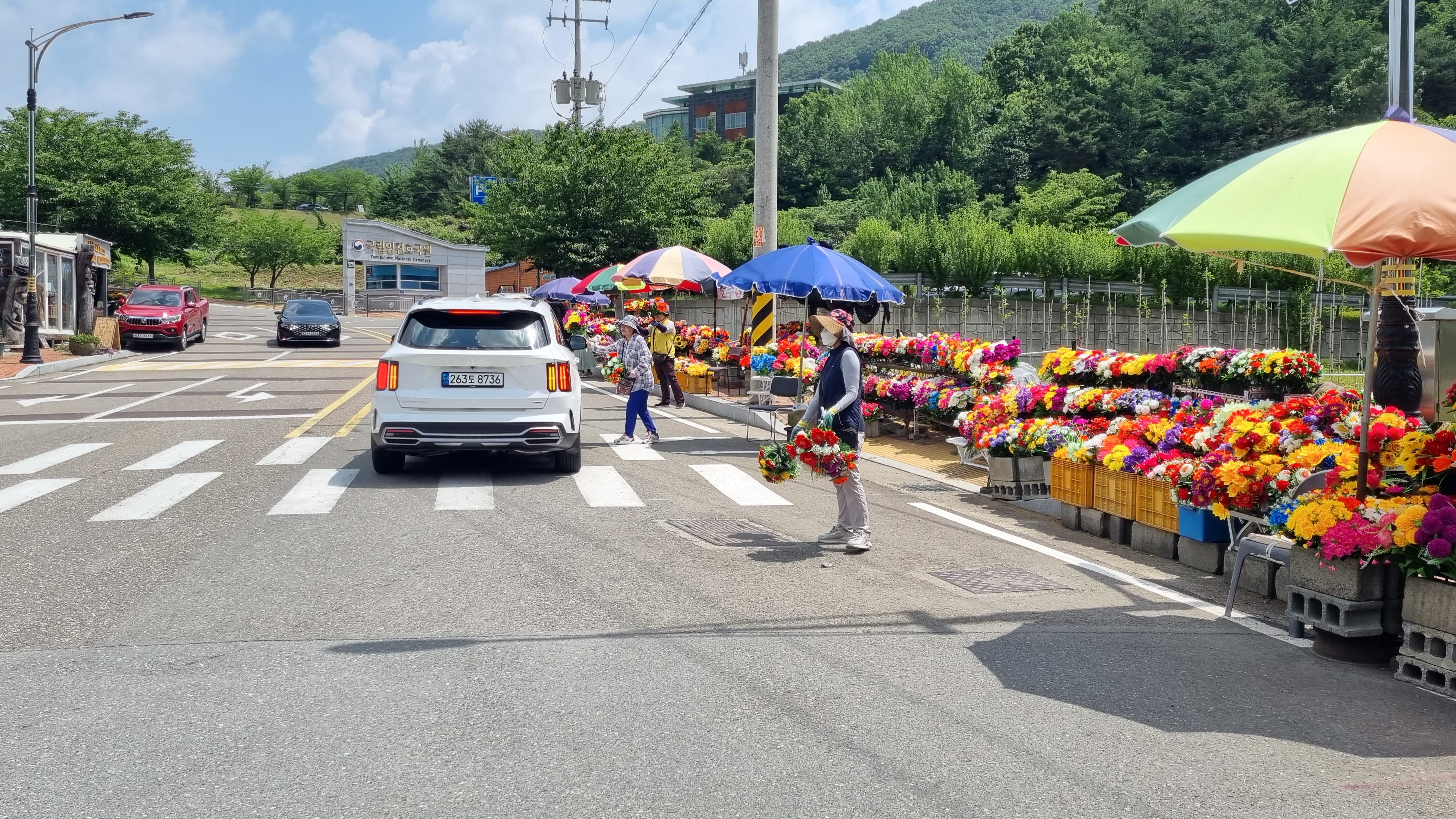 호국원 들어가기 전 양쪽 꽃가게 아주머니들은 모처럼 많은 손님들이 몰려오자 분주하게 움직이며 자신들의 꽃가게 꽃(생화, 조화)을 자랑하며 손님들을 불렀다.