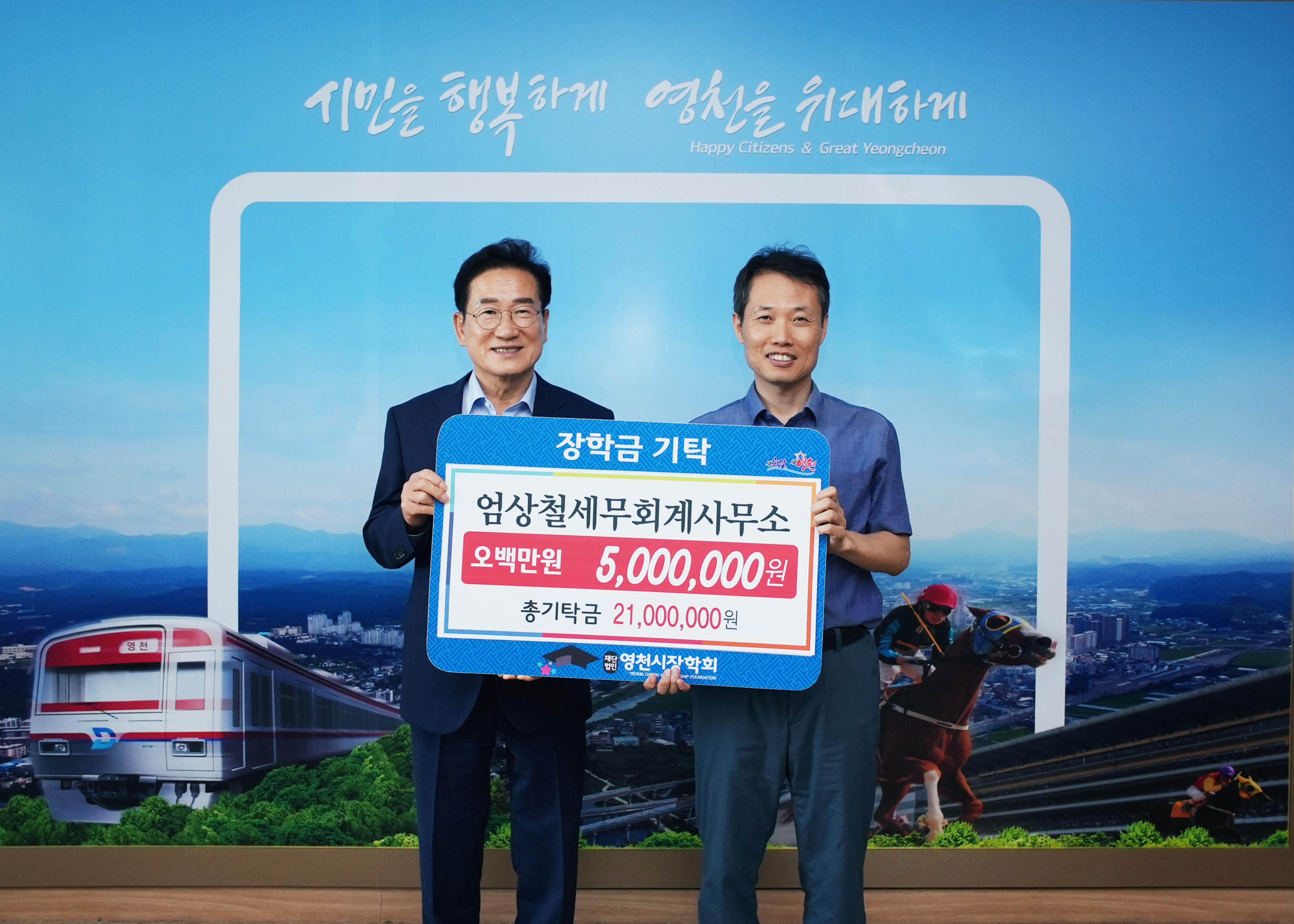 엄상철 세무회계사무소 대표 엄상철 세무회계사는 2017년에 영천시장학회 외부회계감사를 보게 되면서 지역 인재 양성에 관심을 갖게 되었고 2018년부터 올해까지 매년 장학금을 기탁해 누적 기탁금액은 2100만원에 이른다. 엄상철 세무회계사는 “나 또한 영천 출신으로 고향 후배들의 무한한 꿈을 응원하기 위해 기탁을 이어오고 있다.”며 “지역 인재양성에 조금이나마 보탬이 되길 바란다.”고 전했다.