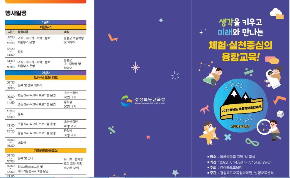 경북교육청(교육감 임종식)은 14일(금)부터 15일(토)까지 양일간 울릉중학교에서 울릉도 초·중학생 및 학부모를 대상으로‘2023학년도 울릉창의융합캠프’를 개최한다.