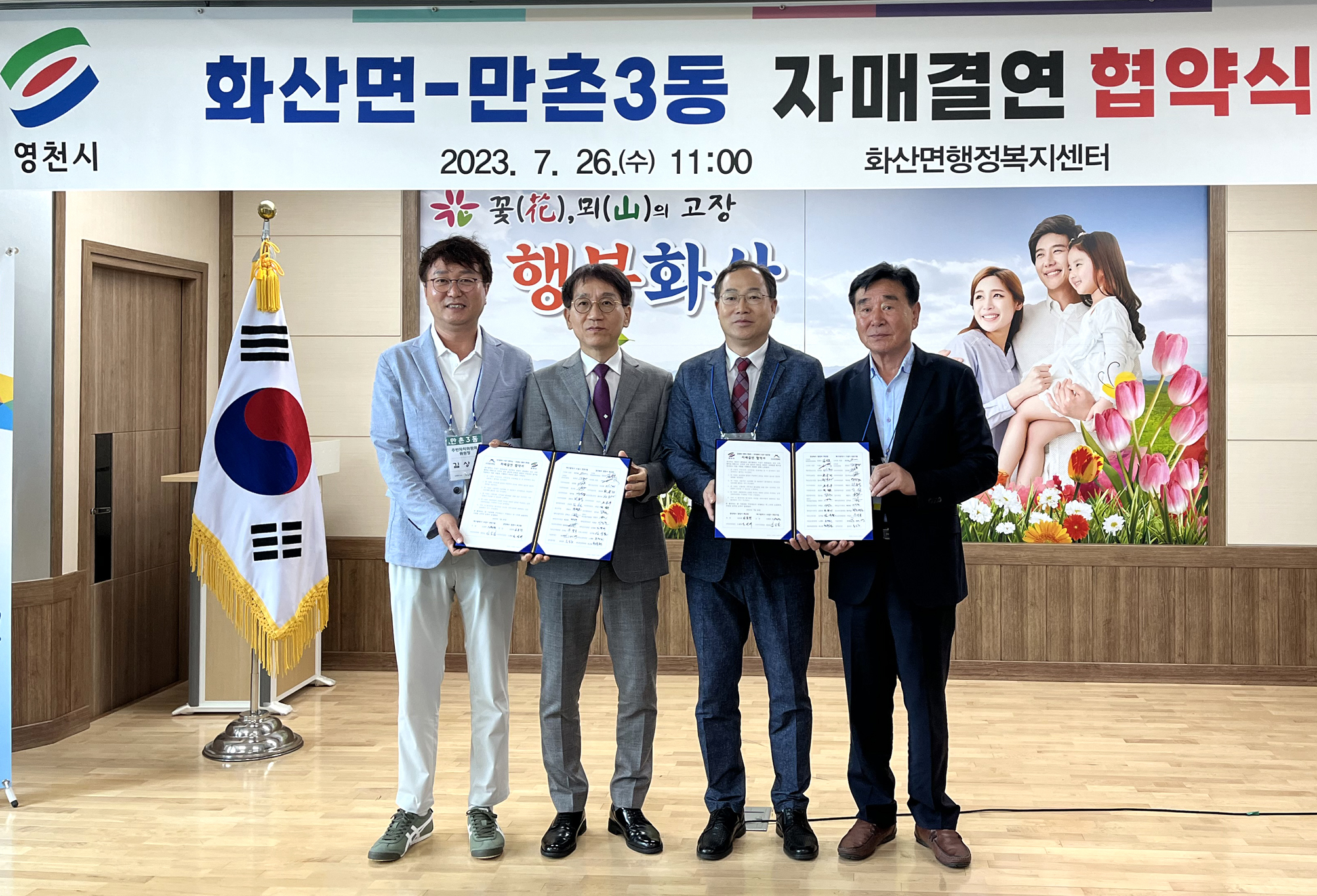 영천시 화산면은 7월 26일 화산면 행정복지센터 회의실에서 대구광역시 수성구 만촌3동(동장 김종완)과 활발한 교류와 상생발전을 위한 자매결연 협약을 체결했다.