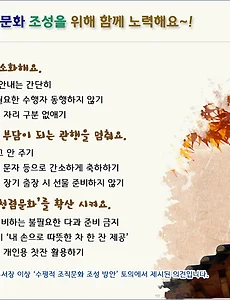 반응형 경상북도13478 경북교육청, 수평적 조직문화 조성을 위해 관리자가 나서 경북교육청, 수평적 조직문화 조성을 위해 관리자가 나서 의전 간소화와 불필요한 관행 STOP,‘차 한 잔 청렴문화’확산 경북교육청(교육감 임종식)은 지난 9일 도교육청 홍익관에서 교육감, 부교육감, 국장과 도교육청 과장 등 19여명이 참석한 가운데‘청렴도 향상을 위한 수평적 조직문.. 2019. 9. 12. 경북도 관광사진공모전, 아름다운 사진을 찍어주세요! 경북도 관광사진공모전, 아름다운 사진을 찍어주세요! 경북의 아름다운 관광자원을 발굴하기 위한 사진공모전 개최 경북 도내의 관광 활성화와 홍보를 위해 2019년 사진공모전 열려 천진난만한 동심.. 자연이 주는 선물.., 최고의 사진을 찍어주세요 경상북도는 도내의 산재한 관광자원을.. 2019. 9. 11. 추석명절 공중화장실 이용 편의대책 추진 추석명절 공중화장실 이용 편의대책 추진 이용객 증가 대비 위생, 청결, 범죄예방 및 안전대책 중점추진 경상북도는 추석명절 기간중 고향을 찾는 귀성객들이 안전하고 깨끗한 화장실을 이용할 수 있도록 도내 공중화장실에 대한 일제점검을 실시하고 편의대책을 추진한다고 밝혔다. 이.. 2019. 9. 11. 경북의 비경을 드론에 담아주세요~ 경북도, 드론 영상 공모 경북의 비경을 드론에 담아주세요~ 경북도, 드론 영상 공모 내달 31일까지 ‘경상북도 드론 영상 공모전’개최, 국민 누구나 참여 가능 도내 곳곳의 아름다운 명소와 깨끗한 자연환경, 도민의 삶이 녹아있는 농어촌 현장 등 경상북도는 드론을 활용해 경북만의 아름다운 관광자원과 자연.. 2019. 9. 10. 이철우 경북지사 - 권영진 대구시장, 교환근무 실시 이철우 경북지사 - 권영진 대구시장, 교환근무 실시 지난년도 10월에 시작하여... 이번이 네번째 교환근무 추석명절 앞두고 민생현장과 대구경북상생과제 추진현장 점검 이철우 경상북도지사와 권영진 대구광역시장은 작년 10월에 첫 교환근무를 시작한 이후로 10일 대구경북 상생발전을 .. 2019. 9. 10. 경북여성정책개발원, 9일 안동시의원과 함께하는 양성평등 스쿨 개최 경북여성정책개발원, 9일 안동시의원과 함께하는 양성평등 스쿨 개최 ❍ 경북여성정책개발원(최미화 원장) 경북광역여성새로일하기센터가 ⌜안동시의원과 함께하는 양성평등 스쿨⌟을 9일 안동시청 웅부관 청백실에서 열었다. ❍ 이번 양성평등 스쿨은 기관, 직장, 조직 각 분야에서 양.. 2019. 9. 10. 이전 1 ··· 739 740 741 742 743 744 745 ··· 2247 다음