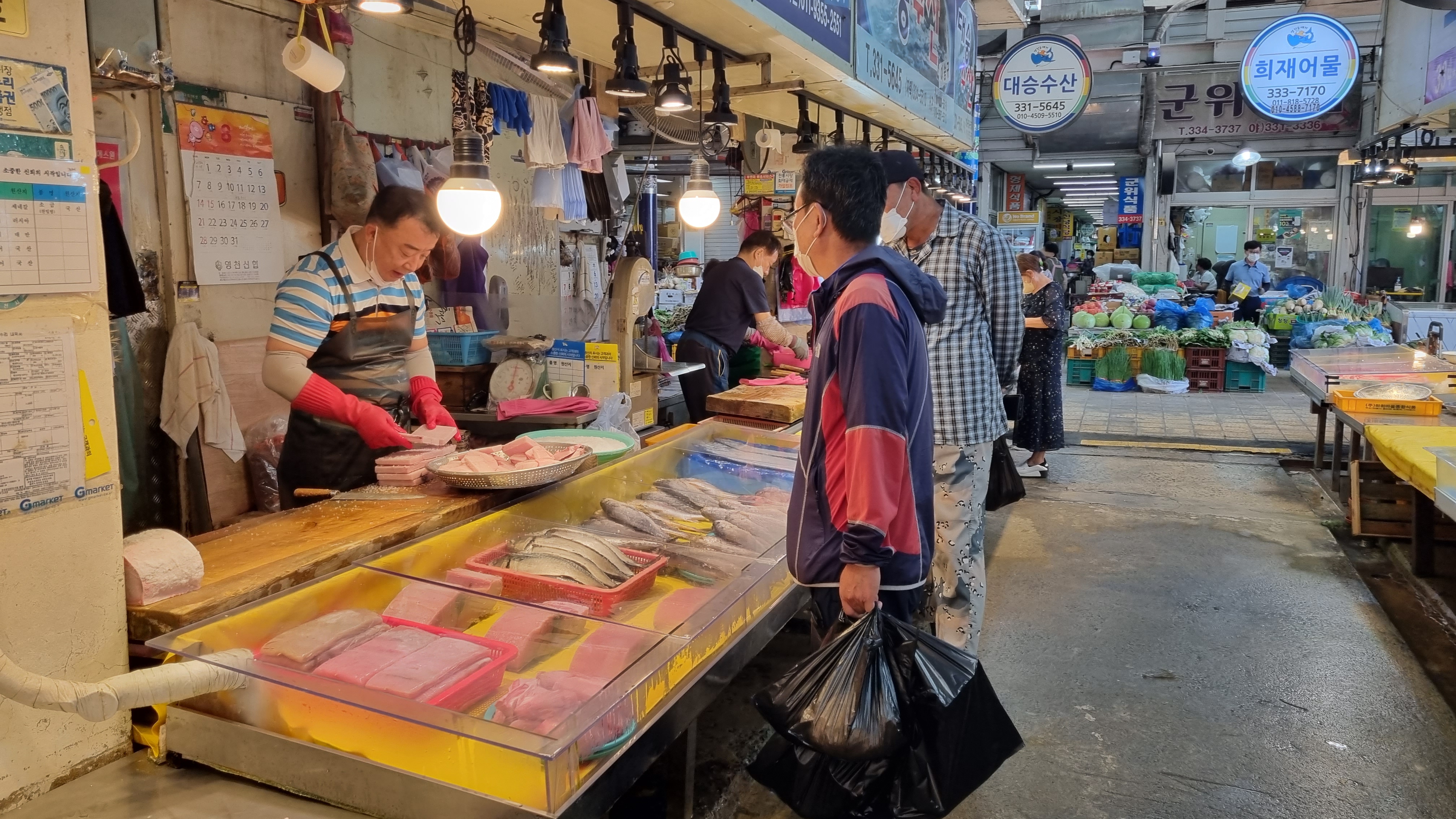 돔배기전, 건어물전, 수육전, 차례상 전, 과일전 등 가게마다 손님들이 1-2명은 계속 찾아오고 있었다.