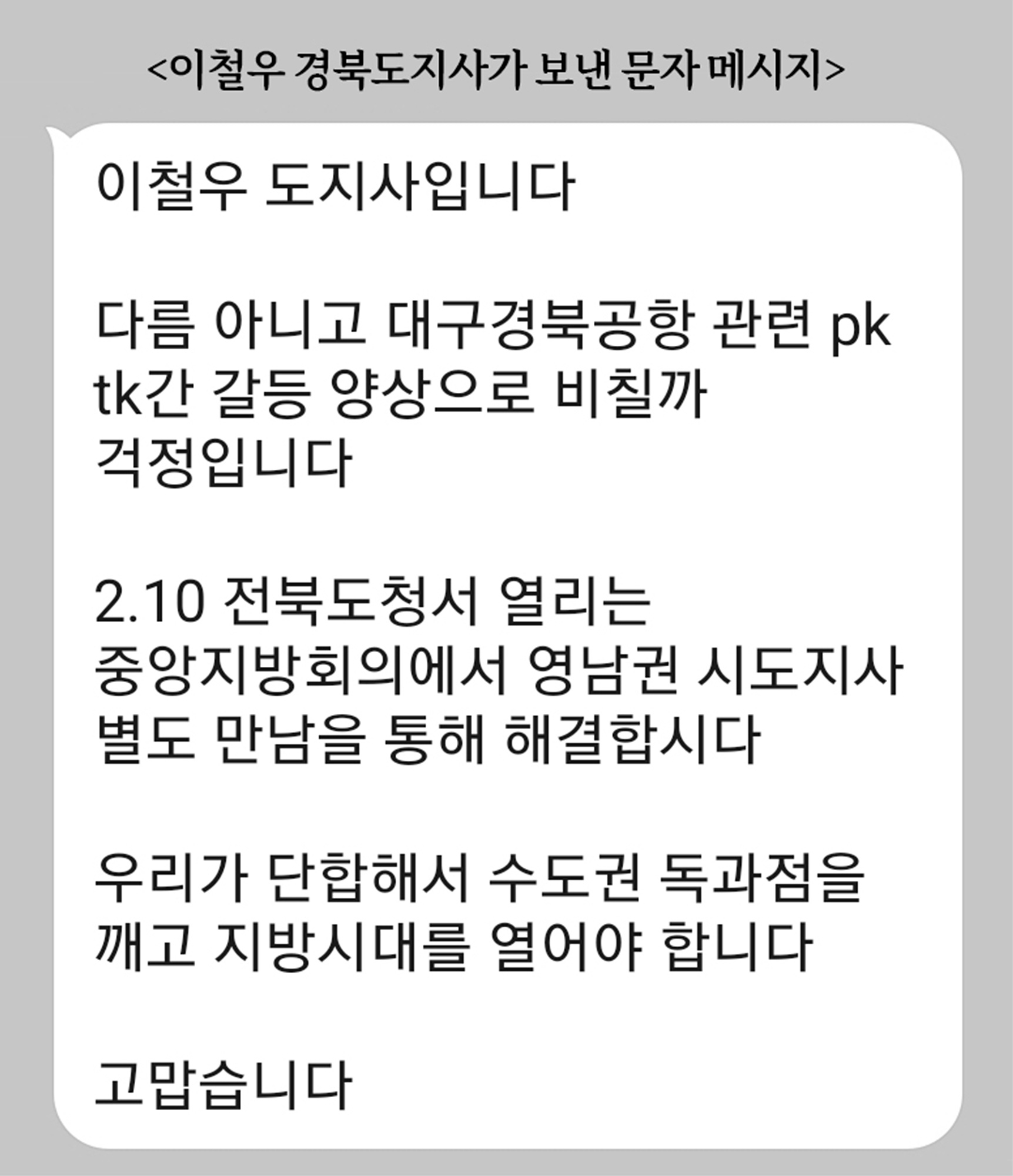 이철우 경상북도지사는 2일 아침 대구 및 부산‧울산‧경남 시도지사들에게 직접 문자 메시지를 보내 최근 대구경북신공항과 관련된 영남권의 갈등 양상에 대해 안타까움을 토로하며 10일 전북도청에서 열리는 중앙-지방협력회의 후 별도 만남을 통해 협의할 것을 제안했다.