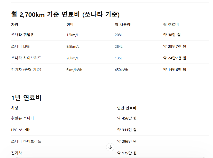 쏘나타 기준으로 월 2,700km 주행 시 연료비를 실제 연비 데이터를 참고해 계산해보겠습니다.