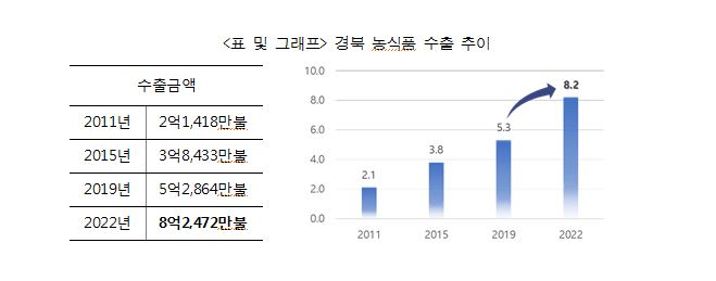 경상북도 발표에 따르면 지난해 경북 농식품 수출액이 8억 2472만불 (약1조656억원)로 전년 동기 6억 3777만불 대비 29.3%증가한 것으로 나타났다. ※ 통계 : 한국농수산식품유통공사 / 환율 : 한국은행(‘22년평균1292.16원/US$) 품목별로는 신선농산물이 복숭아 52.6%, 사과 41.1%, 딸기 17.2%, 팽이버섯 4.7% 증가했고, 가공식품은 곡류 66.8%, 붉은대게살 31.4%, 음료류 8.8%, 주류 0.6% 등이 증가했다. 국가별로는 코로나19 상황의 완화에 따라 동남아시아로 수출이 다시 활기를 띠면서 태국 107.9%, 베트남 50.7%, 대만 40.4%, 홍콩 32.9% 증가하였으며 일본과의 교류확대로 인해 14.4% 증가했다. 경북도는 베트남 등 5개국에 해외상설매장을..