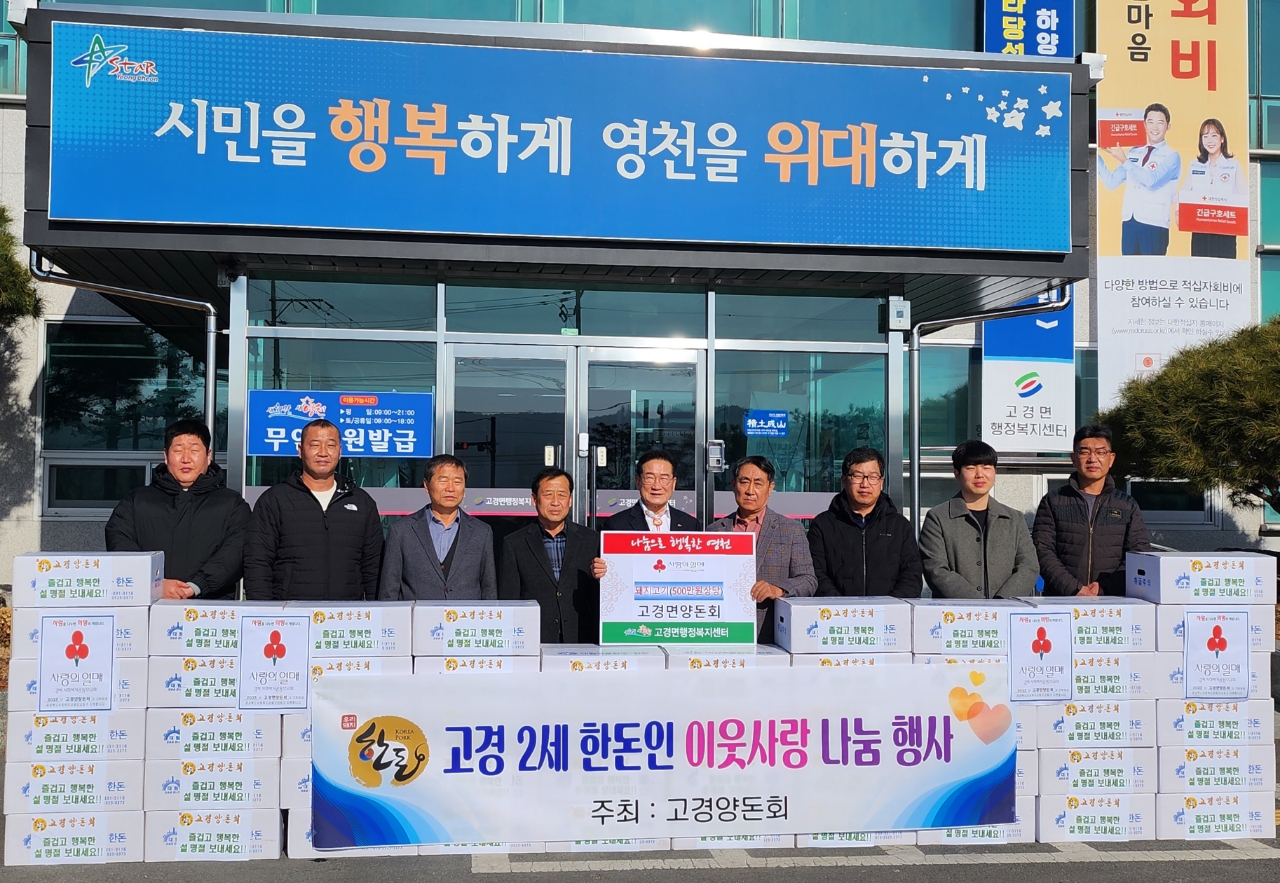 고경면 양돈회, 돼지고기 나눔 실천 고경면 양돈회(회장 류상우)는 1월 10일 고경면 행정복지센터를 방문해 돼지고기 50박스(500만원 상당)를 기탁했다. 고경면 소재 12농가로 구성된 고경면 양돈회는 매년 이웃 사랑을 실천하고 있으며 계묘면 새해를 맞이해 관내 어르신들을 위해 회원들의 마음을 모았다. 류상우 회장은 “추운 겨울 어르신들이 영양을 보충해 건강하게 겨울을 보냈으면 하는 마음으로 돼지고기를 기탁했다.”며 “앞으로도 꾸준히 어려운 이웃들에게 나눔의 손길을 전하겠다.”고 말했다. 영천시 관계자는 “어려운 여건 속에서도 돼지고기 나눔행사를 통해 이웃사랑을 몸소 실천해주신 양돈회 회원분들에게 감사드리고, 따뜻한 마음이 잘 전달되어 소외된 이웃 없이 모두가 따뜻한 계묘면 새해가 되기를 바란다.”고 말..