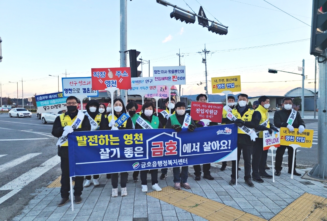 행복가득 영천으로 오세요… 영천주소 갖기 캠페인 금호읍, 민·관 합동으로 실시 금호읍 행정복지센터(읍장 정기열)는 11월 12일 영천시 금호읍 교대 사거리 일대에서 영천시 주소 갖기 캠페인을 실시했다. 이날 캠페인은 금호읍 직원들을 비롯하여 금호읍 이장협의회와 금호읍 새마을협의회, 금호읍 새마을부녀회 등 민·관 합동으로 30여 명이 참여하여 열띤 분위기 속에서 전개됐다. 금호읍 교대 사거리는 대구, 경산 등 인근 지역에서 영천으로 출·퇴근하는 유동인구가 많은 곳으로써 타지역에 거주하는 기업체 직원 및 자영업자, 학생 등을 대상으로 전입신고를 독려하고 전입 시 누릴 수 있는 다양한 혜택을 알리는 홍보 활동을 벌였다. 정기열 금호읍장은 “금호읍은 앞으로도 인구 감소에 대응하여 영천시 주소 갖기 캠페인을 지속..