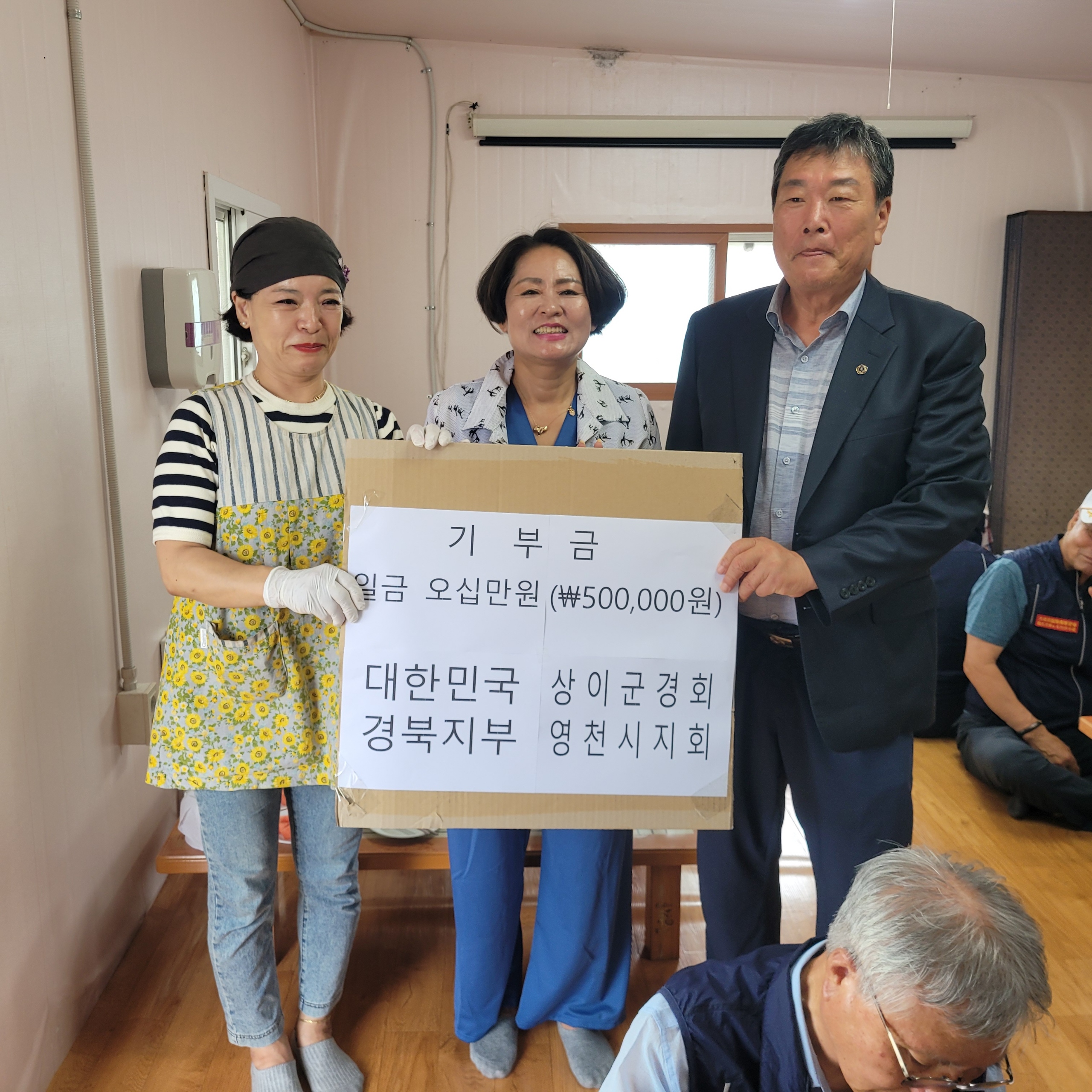 상이군경회, 나눔의집 성금 전달 “상이군경회, 나눔의집 성금 전달” 대한민국 상이군경회 영천시지회(회장 손종곤)는 6월 28일 서부동 관내 나눔의집 무료급식소를 방문하고 상이군경회원들은 무료급식을 어르신들과 함께 한 후 무료급식소에 성금 50만 원을 전달했다. 김병우 시민기자 영 천 시 2023.07.07