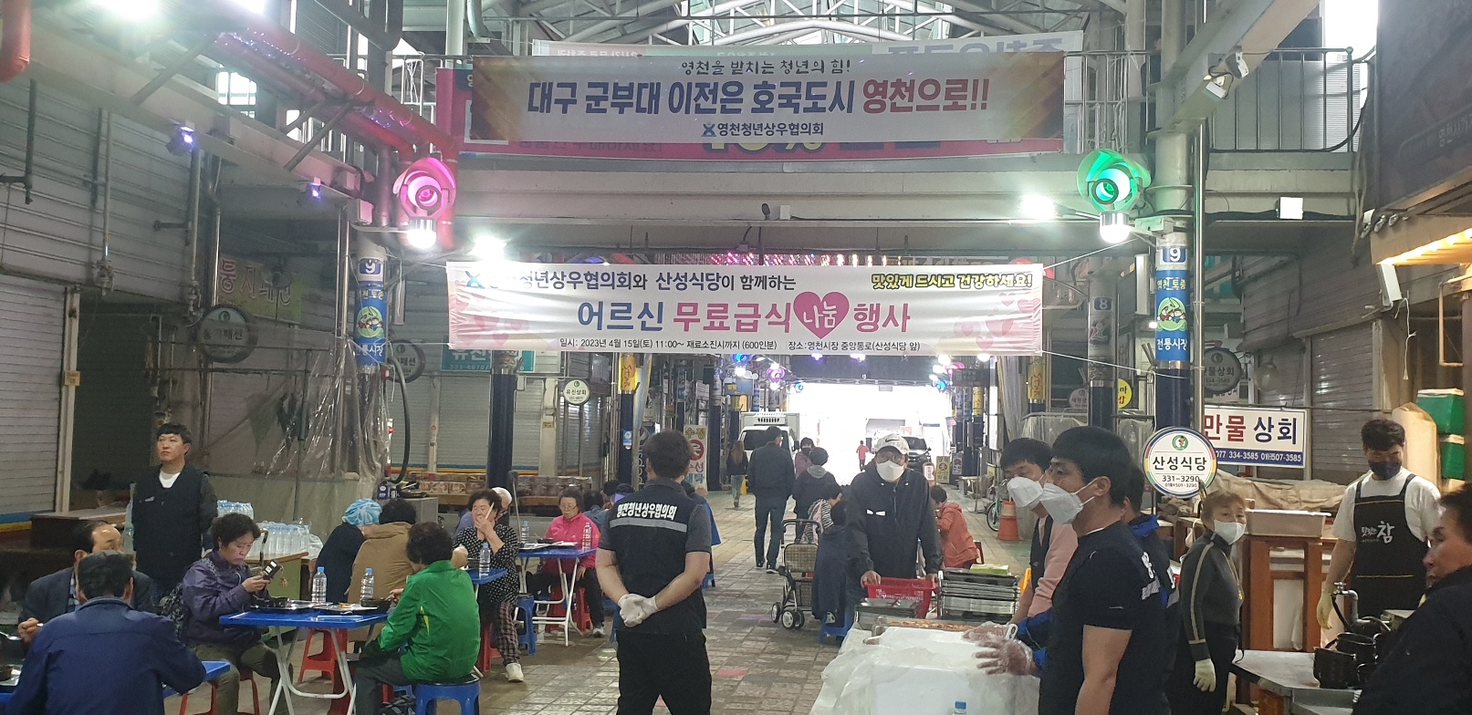산성식당, 어르신 무료급식 봉사 “산성식당, 어르신 무료급식 봉사” 영천공설시장내 산성식당(대표 김순자)에서는 15일 시장 휴무일 어르신 무료급식 봉사활동을 폈다. 봉사활동에는 이만희 국회의원, 최기문 시장, 이춘우 도의원 및 시민 7백여 명이 참석해 즐거운 식사를 하고, 청년상우협의회에서 나와 음식 나누는 봉사활동을 펴기도했다. 김영우 시민기자 영 천 시 2023.04.21