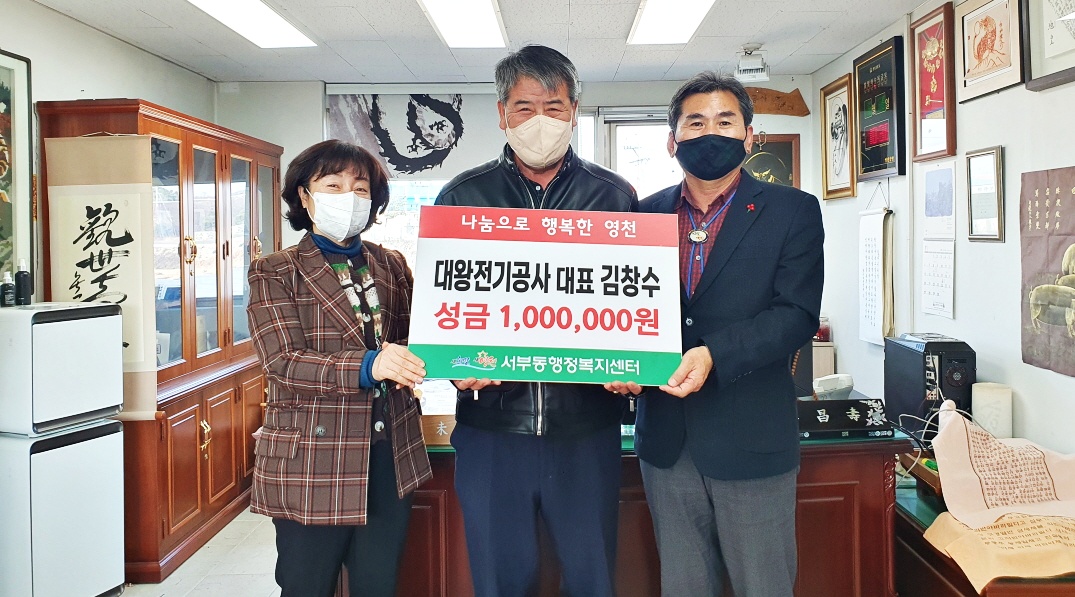 연말연시 맞아 이웃사랑 동참… 희망 2023 나눔캠페인 기탁자 줄이어 김창수 대표, 나눔캠페인 성금 기부 영천시 대왕전기공사(대표 김창수)는 12월 6일 연말을 맞아 ‘희망 2023 나눔캠페인’ 성금 100만원을 서부동에 전달하며 따뜻한 기부의 손길을 전했다. 대왕전기공사 김창수 대표는 성금 및 장학금 기탁, 관내 취약계층 주거환경 개선지원 등 매년 꾸준한 기부와 재능 나눔을 실천하며 나눔 문화에 앞장서고 있다. 김창수 대표는 “지역 내 소외된 계층 없이 모두가 따뜻한 연말연시가 되길 바라는 마음으로 기부문화에 동참하게 됐다. 작은 정성이 잘 전해져 조금이나마 따뜻한 위로가 되길 바란다”고 전했다. 강대활 서부동장은 “지역사회를 위해 나눔 문화에 앞장서는 김창수 대표님께 감사드리며 기부 성금은 복지증진을..