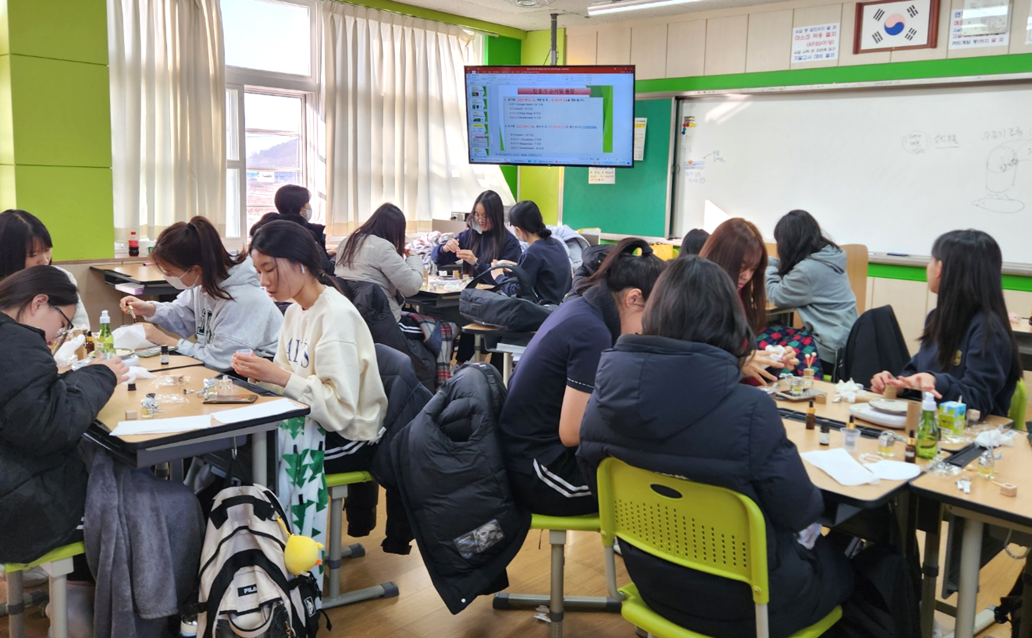 성남여중 아로마힐링 행복한 체험 학습 영천시 성남여자중학교(학교장 오상종)는 올해 4월부터 12월까지 매월 5회기 이상 재학생을 대상으로 ‘아로마 힐링 행복한 체험학습 프로그램’을 진행하였다. 영천시 교육경비 보조금 지원 사업인 ‘학교 브랜드화를 위한 특화사업’의 일환으로 진행된 프로그램은 아로마테라피 체험을 희망하는 재학생 및 심리 정서적 위기학생을 대상으로 교내 Wee 클래스 및 각반 교실에서 진행하였다. 영 천 시 2023.01.02