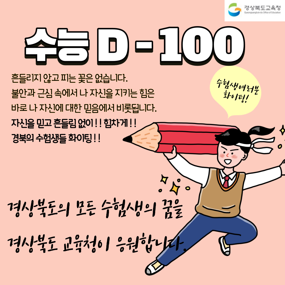 경북교육청(교육감 임종식)은 2023학년도 대학수학능력시험 D-100일을 맞이해 수험생들을 위한 학습 전략 자료를 제작해 도내 각 고등학교로 배포했다고 10일 밝혔다. 이번 자료는 2년 차에 접어드는 인문·자연 통합 수능을 준비하는 수험생들을 위해 경상북도교육청연구원 산하 경북진학지원센터에서 맞춤형 학습 전략 자료를 배포한 것으로 도내 고등학생들의 대입 준비에 실질적인 도움이 될 것으로 기대하고 있다. 학습 전략 자료의 대략적인 내용은 아래와 같으며, 이를 바탕으로 제작된 카드 뉴스와 임종식 교육감의 수험생 격려 영상은 경북교육청 공식 유튜브 채널‘맛쿨멋쿨’에서 확인할 수 있다. Ⅰ. 영역별 학습전략 □ 국어 영역 국어영역은 독서와 문학 그리고 화법과 작문 혹은 언어와 매체로 구분된다. 독서 부분은 독서..