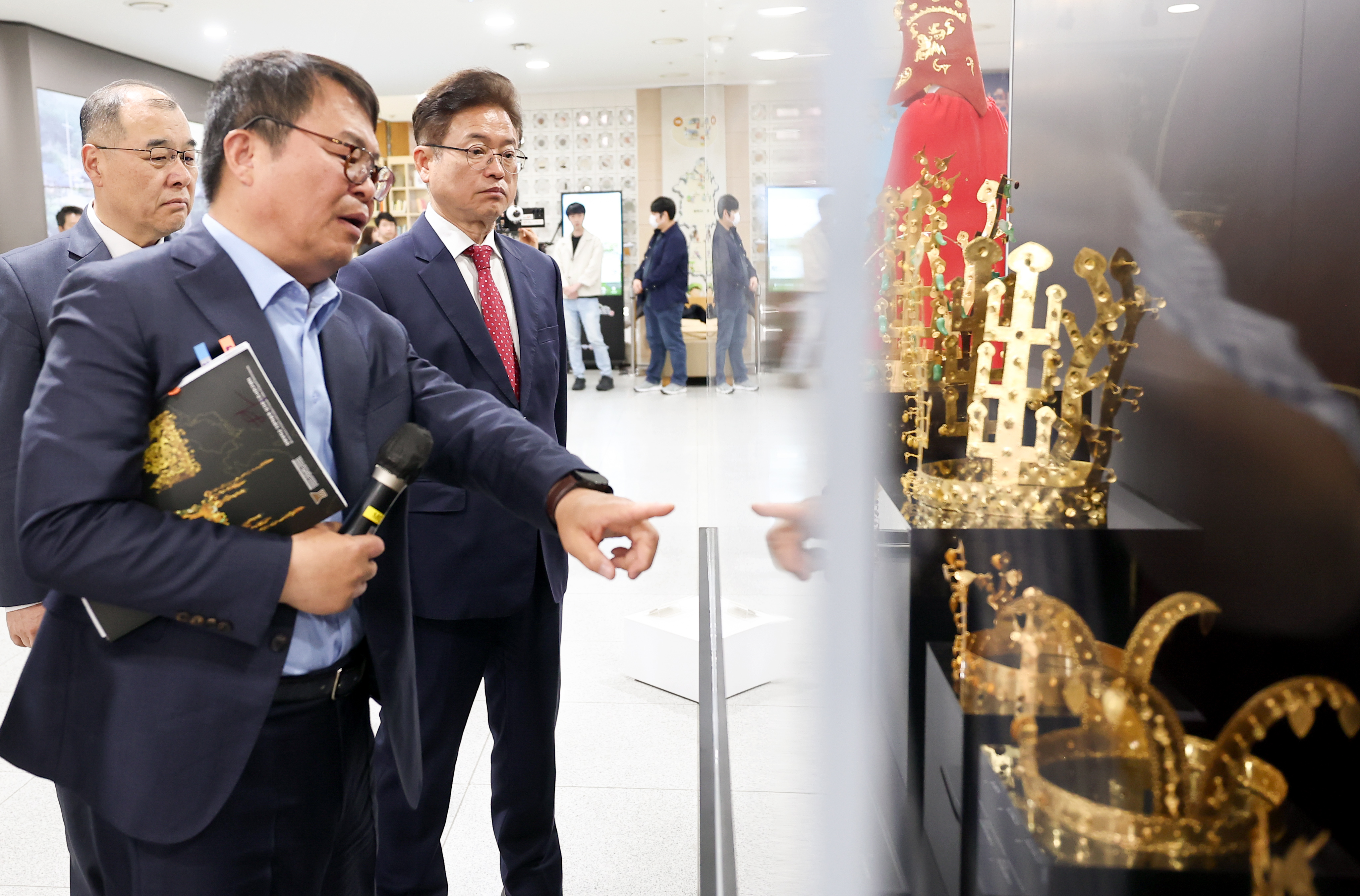경북도는 25일 도청 안민관 K-창에서 이철우 경북도지사, 홍원화 경북대학교 총장, 박천수 경북대학교박물관장, 김성학 경주부시장 등이 참석한 가운데 ‘신라 황금문화와 유리의 길을 찾아서’라는 주제로 전시 개막식을 가졌다. 이번 전시는 경북도청 안민관 서편 로비에서 5월 19일까지 진행되며 경북대학교박물관에서 수집한 로마와 페르시아, 이슬람의 유리기, 유라시아 금관 및 복식 유물 28점을 통해 신라의 황금문화와 더불어 유리가 초원로, 사막로, 해로로 이입되는 과정과 역사적 배경을 입체적으로 선보인다. 특히 개막식에 진행된 박천수 경북대학교박물관장의 실크로드 문명사 강연에서 신라가 유라시아를 향해 열린 진취적인 국가임을 엿볼 수 있었다. 경북도는 실크로드를 통해 유라시아 국가들과 교류한 신라인들 특유의 진취..