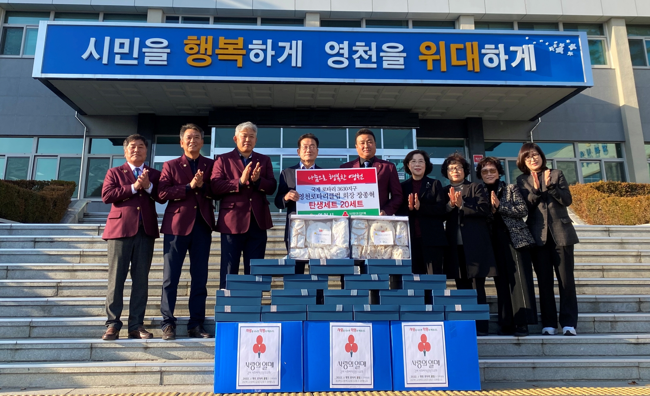 영천로타리, 출생아기 축하선물 기부 영천시는 11월 17일 국제 로타리 3630지구 영천 로타리클럽으로부터 출생아기 축하 탄생세트 20세트(400만원 상당)를 기부 받았다. 영천시청 전정에서 진행된 기탁식에는 영천시장, 영천 로타리클럽 장종혁 회장, 영천 시니어클럽 라인선 관장을 비롯해 탄생세트 제작에 참여한 시니어클럽 회원들이 함께 참석해 의미를 더했다. 전달받은 ‘탄생세트’는 임신과 출산을 축하하고 첫 육아용품 선택에 대한 고민을 덜어주기 위해 제작된 것으로 총 9종으로 구성되어 있다. 기부대상은 2022년 11월 1일 이후 출생아로, 출산일 기준 부 또는 모가 영천시에 주소를 둔 기준중위소득 100%이하 가구이다. 기준 중위소득은 출산 가구의 신청월 기준 전월 건강보험료로 판단한다. 배부기간은 11..