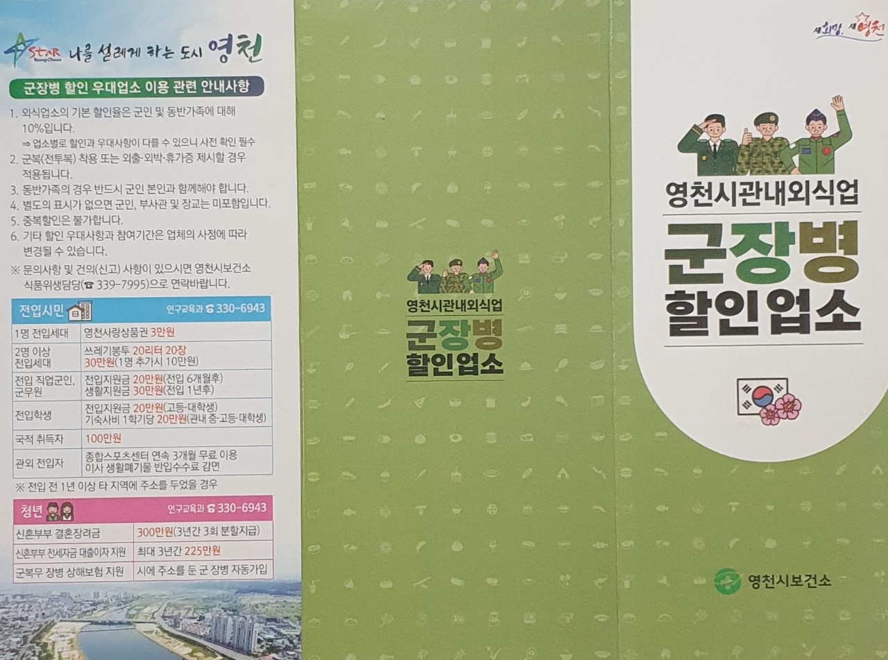 군장병 할인업소 재정비… 군부대유치 힘 보태다 군인 동반가족 10% 할인 영천시가 관내 외식업을 대상으로 군장병 할인업소를 재정비하고 대대적인 홍보에 나섰다. 시민주도의 대구군부대 영천유치활동과 맞물리면서 분위기조성에 우회적으로 힘을 보태고 있어 비상한 관심을 끌고 있다. 시는 최근 군장병 우대할인업소 현황을 담은 유인물을 새롭게 제작해 각계에 배포하고 홍보에 적극 나서고 있다. 관내 외식업체 중 군장병 할인업소는 총 106개소이다. 읍면동별로 보면 시내 중심가로 외식업소가 많은 중앙동이 33개소로 가장 많았다. 그 다음으로 동부동 20개소, 완산동 18개소, 금호읍 8개소, 임고면 7개소, 청통면 6개소, 고경면 5개소, 남부동·서부동 각 4개소, 북안면 1개소 순이었다. 취급식품은 한식 중식 커피 음..