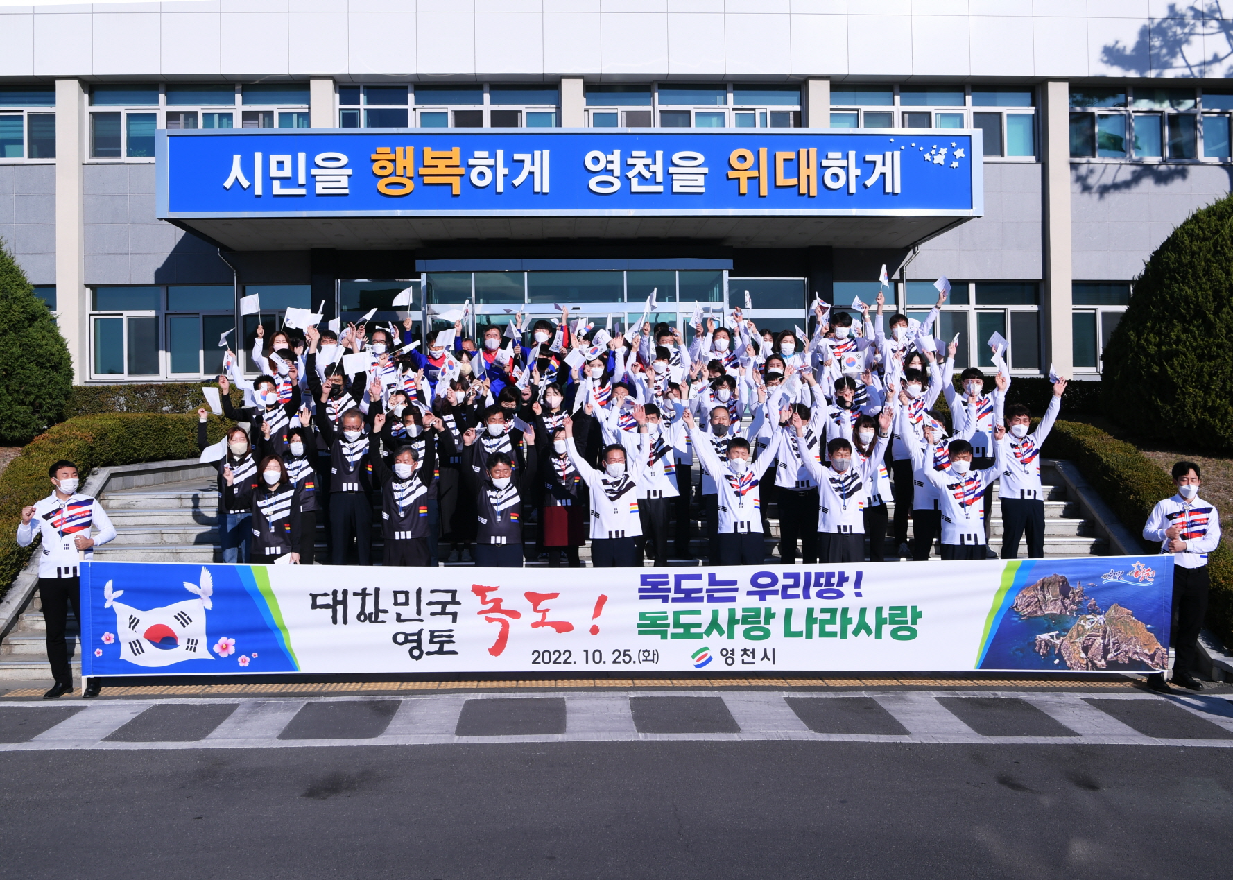 ‘독도는 우리 땅’… 독도의 날 행사 ‘독도는 우리 땅’… 독도의 날 행사 영천시는 10월 25일 시청 앞 마당에서 직원들이 참석한 가운데 ‘독도의 날 기념행사’를 가졌다. 이번 행사는 1900년 10월 25일 독도를 울릉도의 부속 섬으로 명시한 대한제국칙령 제41호 반포를 기념하고 독도수호 의지를 다지기 위해 개최됐다. ‘독도사랑 티셔츠’를 입고 출근한 직원들은 태극기를 흔들며 ‘독도는 우리 땅’ 노래를 제창하고 ‘독도는 우리 땅’을 외치며 만세 삼창했다. 영 천 시 2022.11.02