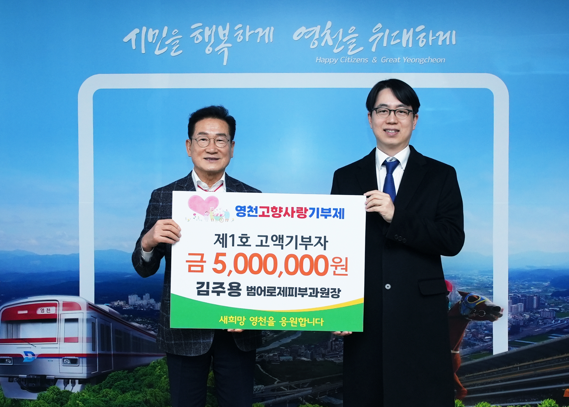 영천사랑 싣고… 고향사랑 1호 고액기부자 김주용 범어로제피부과원장 영천시는 1월 4일 고향사랑기부제가 시행된 첫해에 최고 한도액 500만원을 기부한 김주용 씨를 1호 고액기부자로 등록했다. 김주용 씨는 대구 수성구에서 범어로제피부과 원장으로 근무하고 있으며 지난 4일 영천시청을 방문하여 고향사랑기부금 500만원을 기부했다. 김주용 원장은 “대구 토박이지만 우진 농업회사법인 최진욱 대표를 통해 알게 된 영천은 아주 매력적인 곳으로 영천의 고향사랑 1호 고액기부자로 등록된 것을 영광으로 생각하며 앞으로도 영천의 발전과 함께 할 것을 약속드린다.”고 밝혔다. 최기문 영천시장은 “어려운 여건에도 영천발전을 위해 따뜻한 마음을 전해준 김주용 원장님께 감사드린다.”며 “올해 처음 시행하는 고향사랑기부제의 성공적인 ..