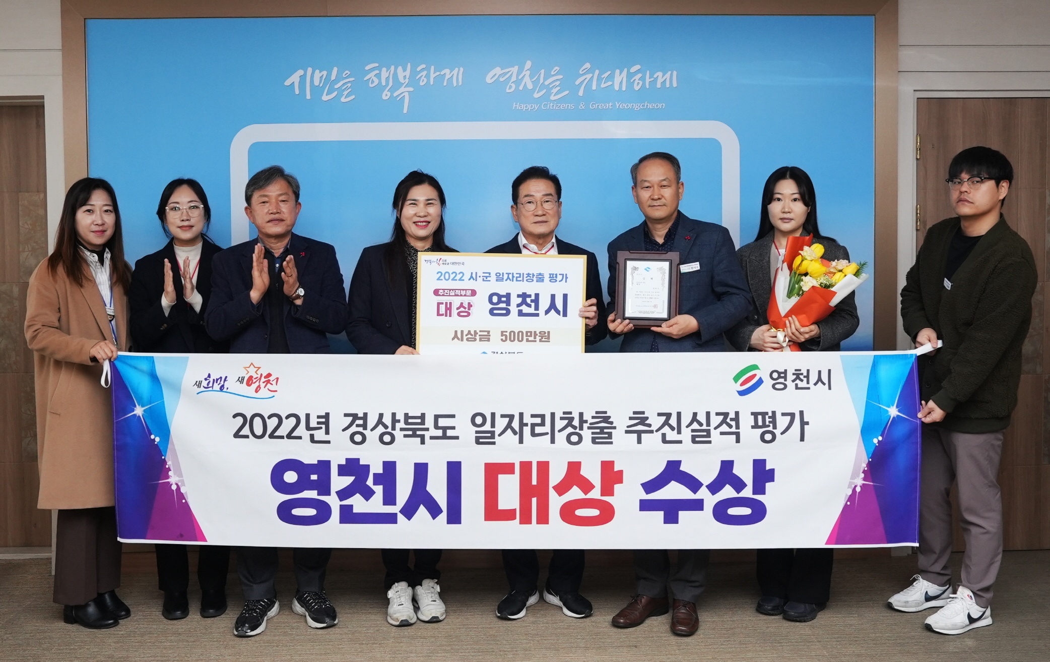 경상북도 일자리 창출 평가 ‘대상’ 영천시는 12월 21일 경상북도에서 주관하는 2022년 시·군 일자리 창출 추진실적 평가에서 대상을 수상하며 3년 연속 일자리 창출 우수기관으로 선정되는 쾌거를 이뤘다. 이번 평가는 경상북도에서 도내 23개 시·군을 대상으로 일자리 목표 달성도, 고용지표, 좋은 일자리 창출 노력도 등 8개 분야 11개 항목 일자리 분야 전반에 대한 추진실적을 평가하여 우수 시군을 선정했다. 영천시는 올해 일자리 공모사업 추진, 취약계층 공공일자리 사업, 지역 실업자 직업훈련, 청년 취·창업 활성화 등 고용 창출을 위한 끊임없는 노력으로 2022년 일자리 목표 대비 117% 실적을 달성했고(10월 기준), 통계청 2022년 상반기 고용률 66.3%로 도내 시부 1위의 성과를 달성했다. ..